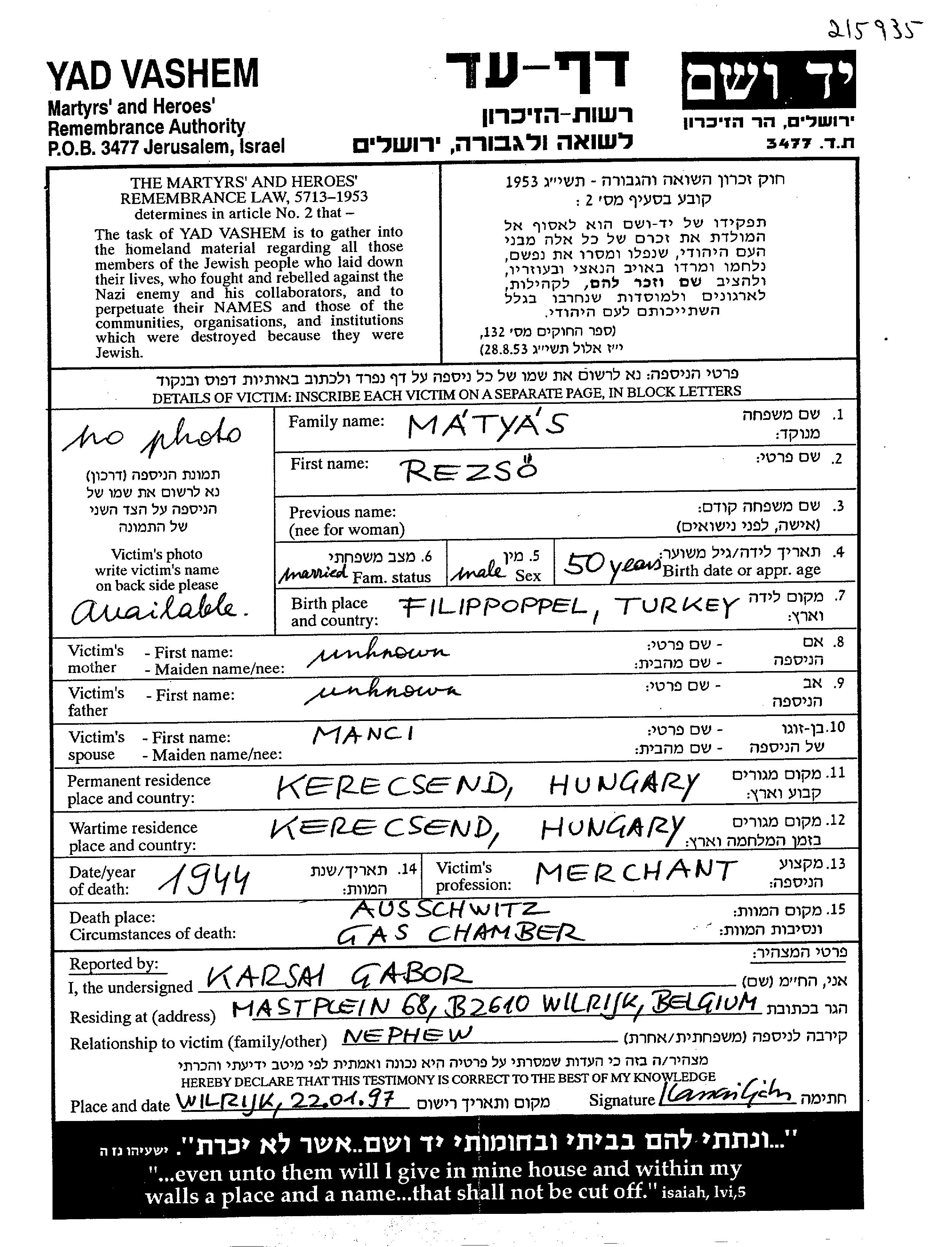 Matyas Rezso Kerecsend, Hongrie Feuille de témoignage