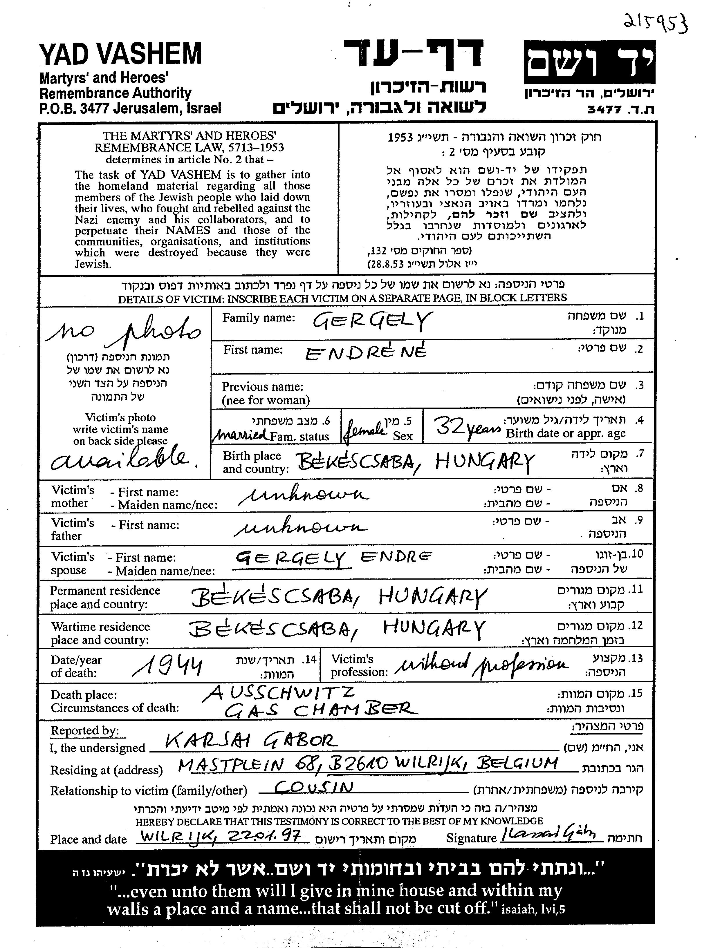 prénom inconnu Gergely est née à Békéscsaba, Hongrie. Elle était Mariée à Andree. Avant la seconde guerre mondiale elle vivait à Békéscsaba, Hongrie. Pendant la guerre, elle était à Békéscsaba, Hongrie.