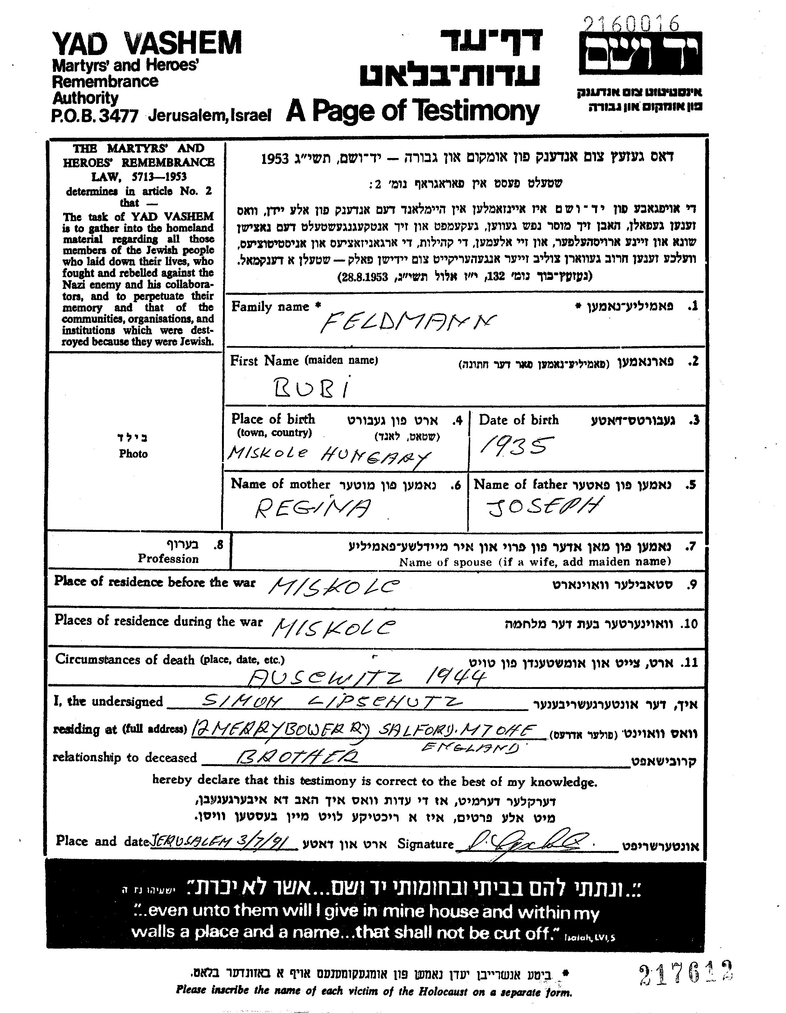 Feldmann Bubi 1935 Miskolc, Hongrie Feuille de témoignage