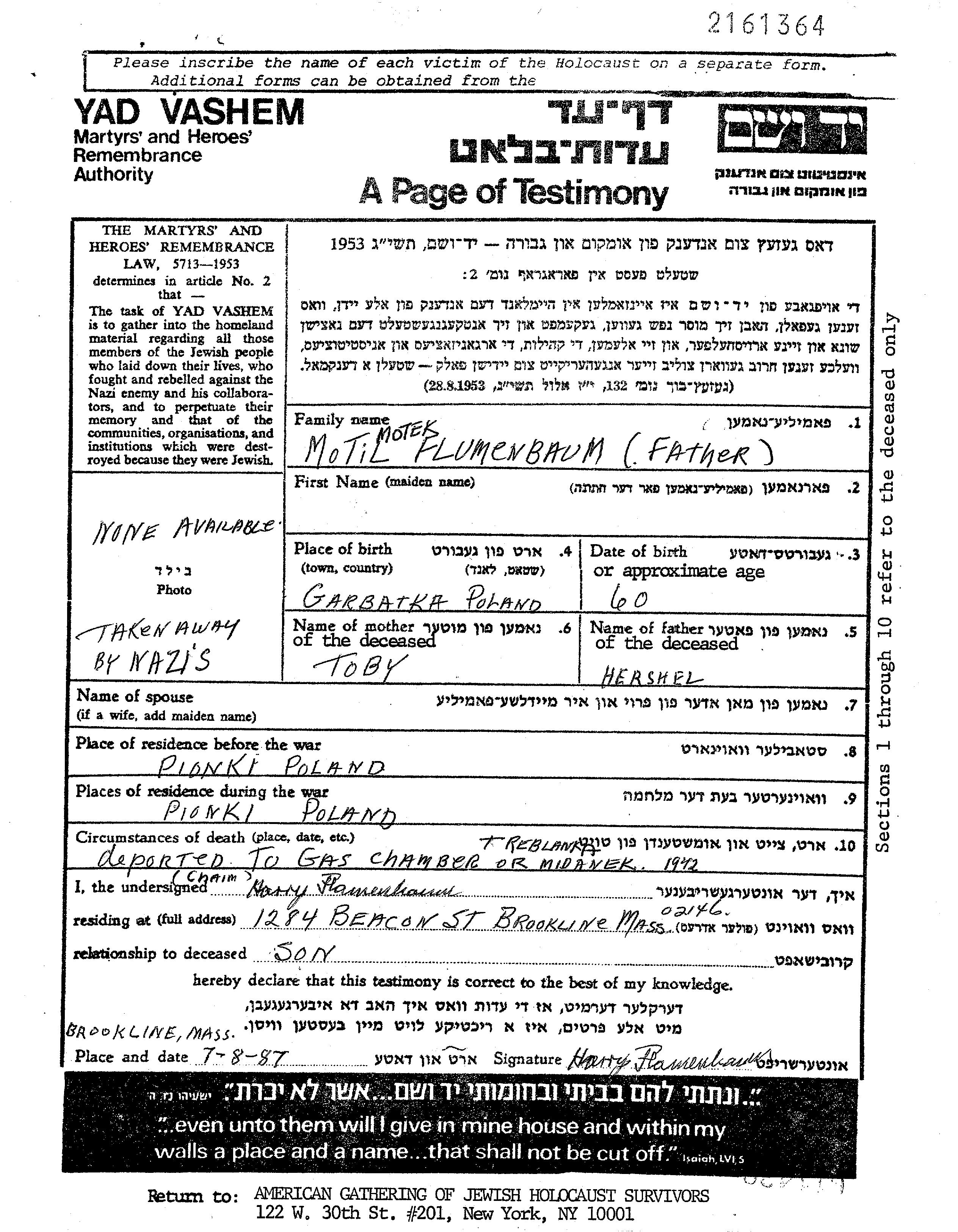 Motil Flumenbaum est né à Garbatka, Pologne en 1882, fils de Hershel et de Toby Tobi. Il était Mariée à Chaja. Avant la seconde guerre mondiale il vivait à Pionki, Pologne. Au cours de la guerre, il était à Pionki, Pologne.