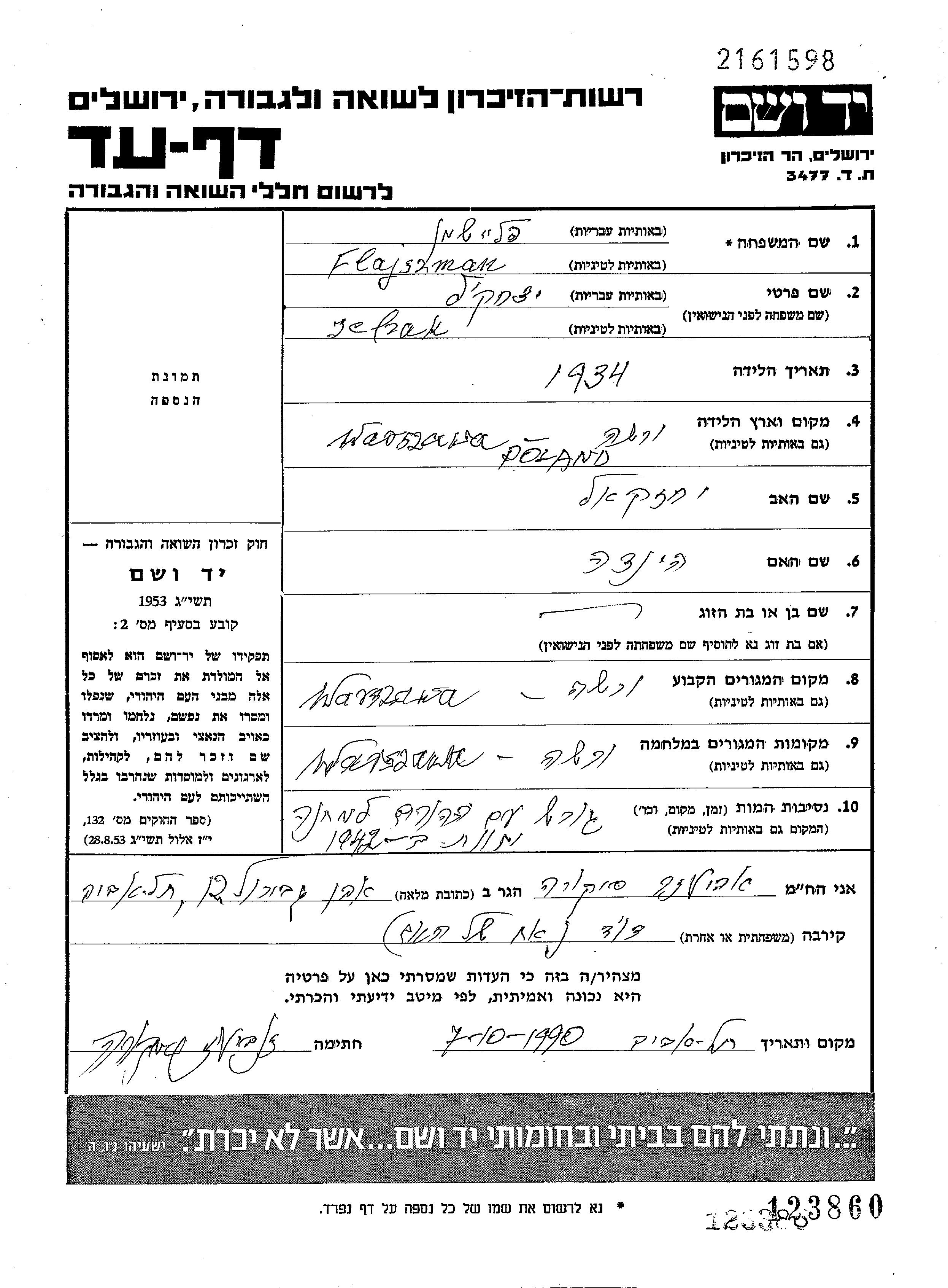 Flajszman Ichak 1934 Warszawa, Pologne Feuille de témoignage