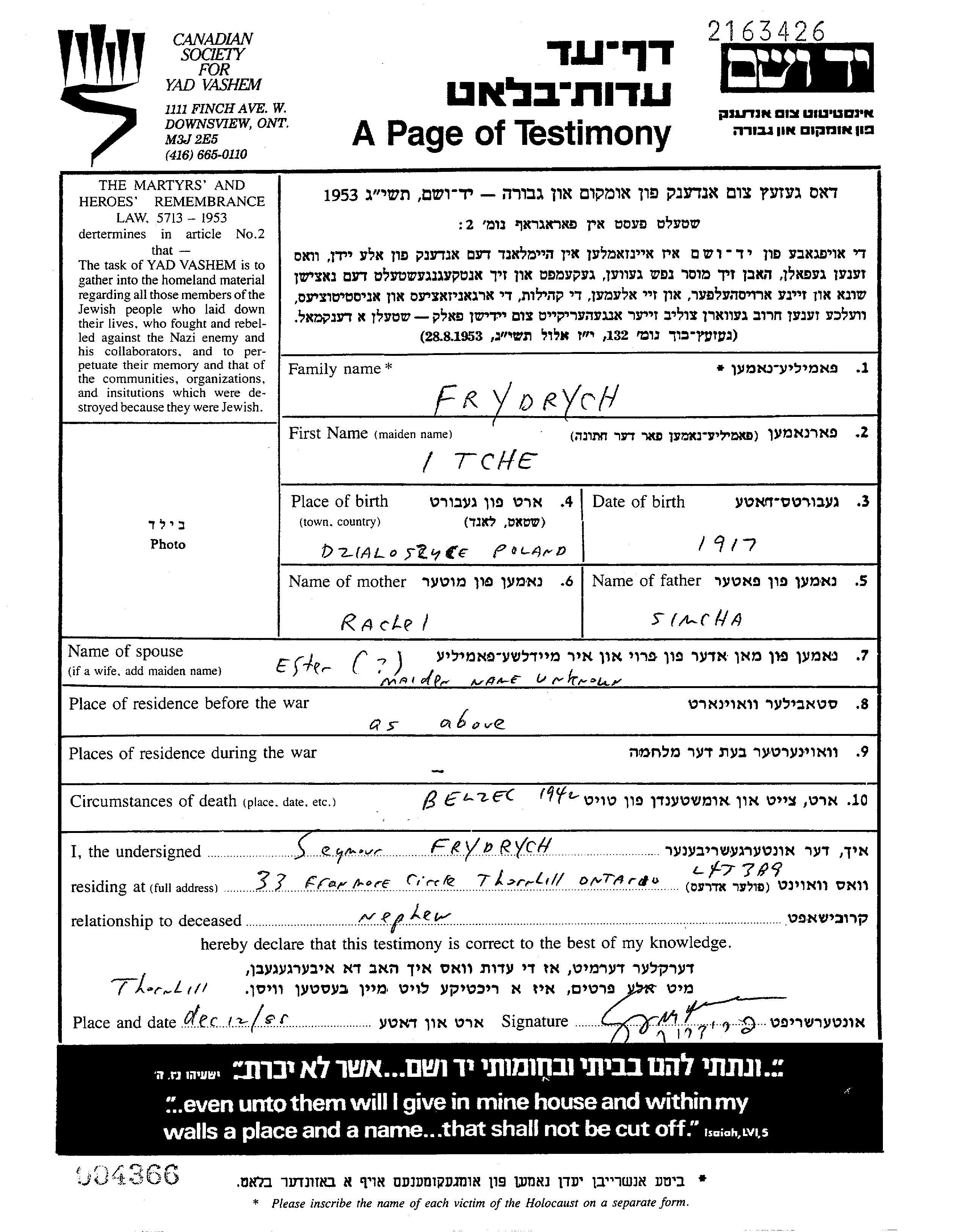 Itche Frydrych est né à Dzialoszyce, Pologne en 1917, fils de Simcha et de Rachel née Frauman. Il était Mariée à Ester. Avant la seconde guerre mondiale il vivait à Dzialoszyce, Pologne. Au cours de la guerre, il était à Dzialoszyce, Pologne.