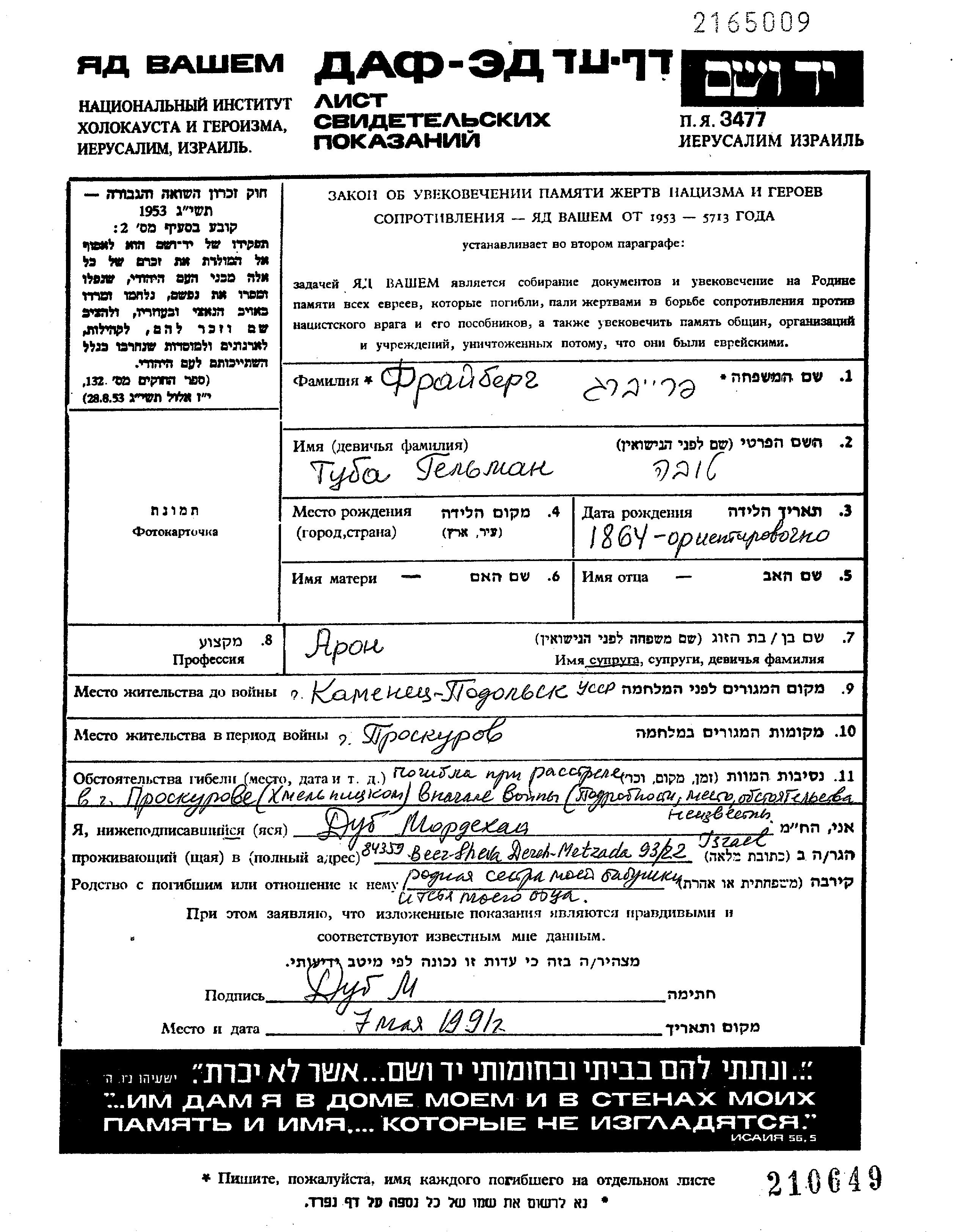 Tuba Tova Fraiberg née Gelman est née en 1864. Elle était Mariée à Aron. Avant la seconde guerre mondiale elle vivait à Kamenets Podolskiy, Ukraine (URSS). Pendant la guerre, elle était à Proskurov, Ukraine (URSS).