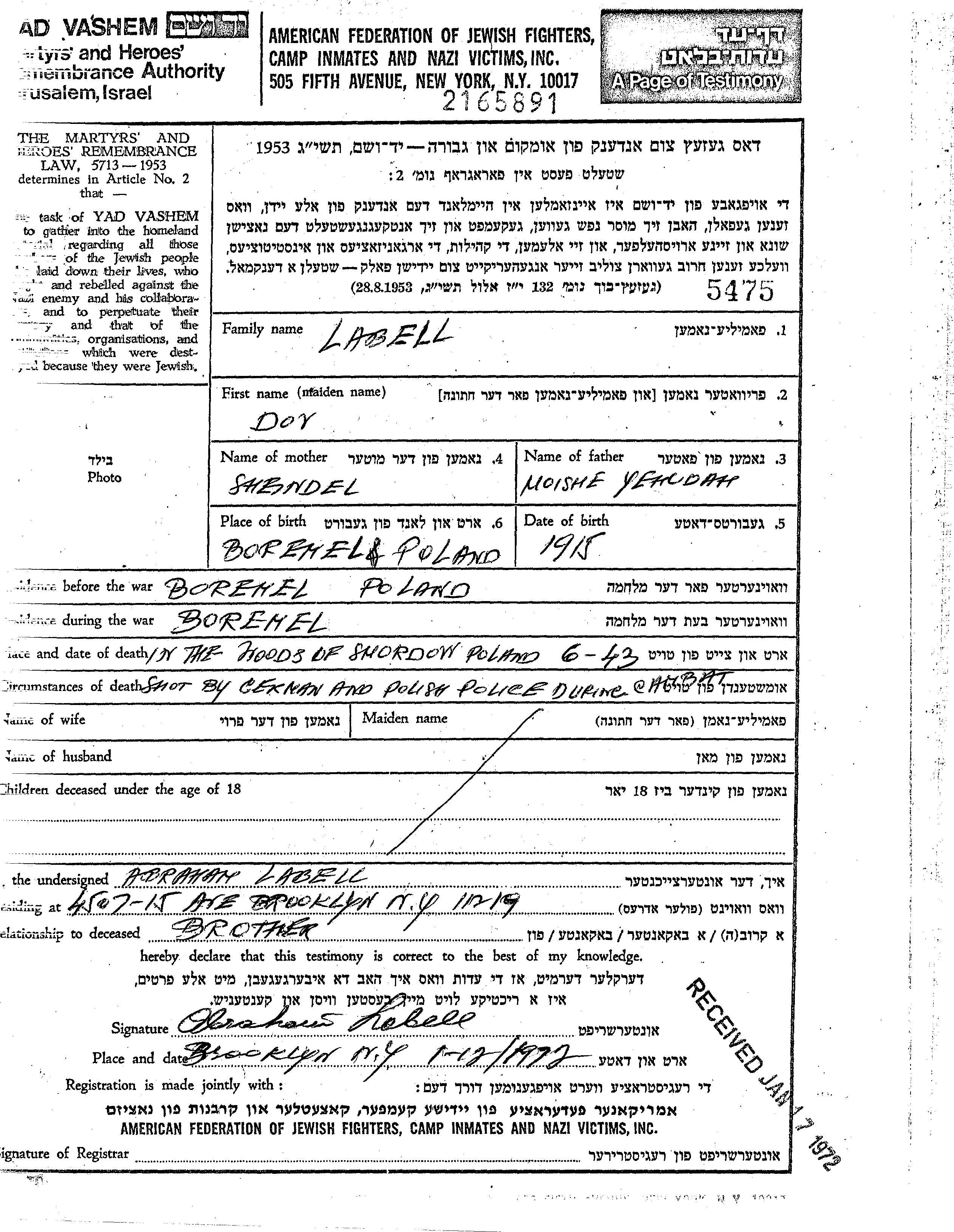 Dov Labell est né à Boremel, Pologne en 1915, fils de Moishe Yehudah et de Sheindl née Kremnitzer. Avant la seconde guerre mondiale il vivait à Boremel, Pologne. Au cours de la guerre, il était à Boremel, Pologne.