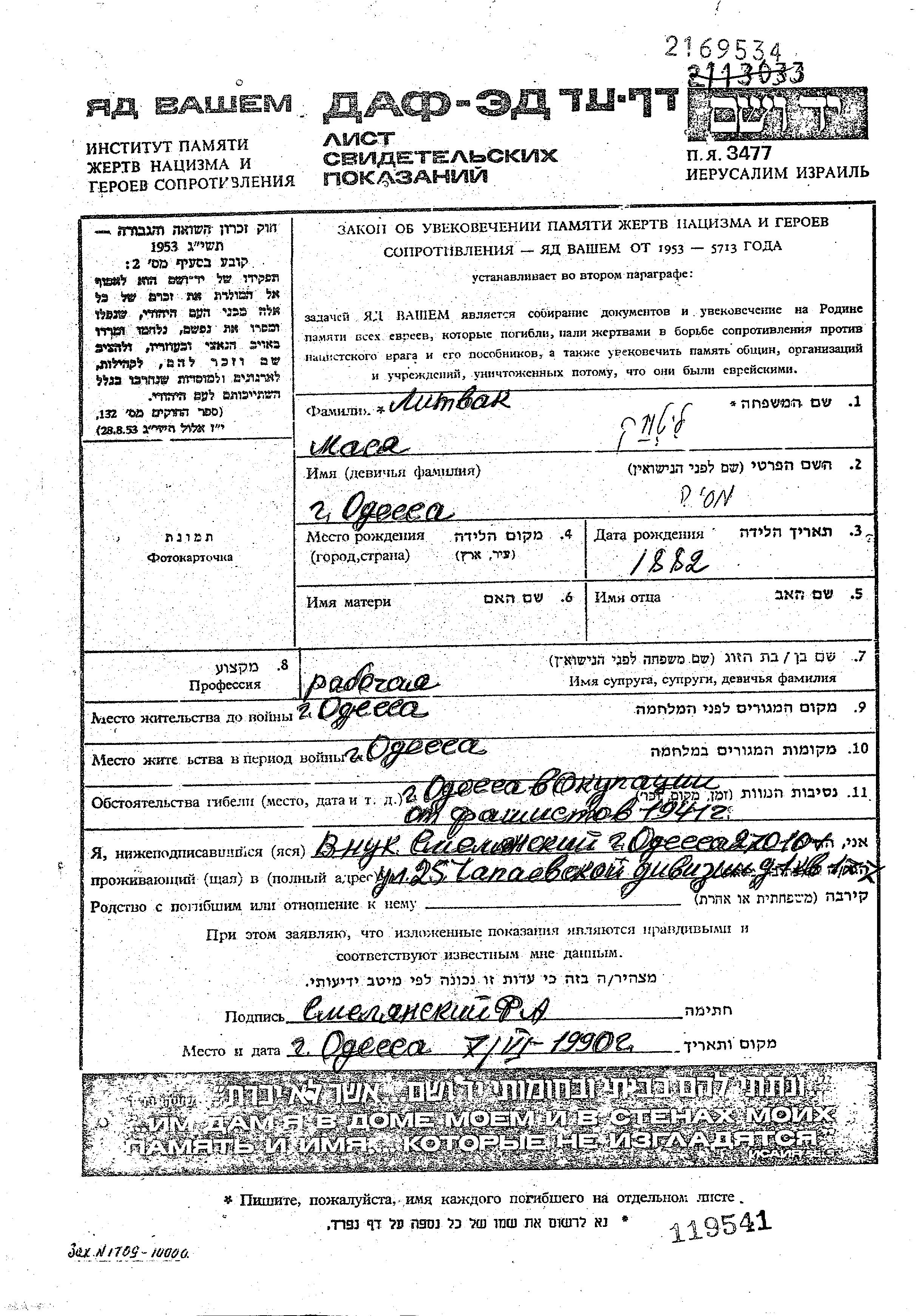 Litvak Masya 1882 Odessa, Ukraine (URSS) Feuille de témoignage