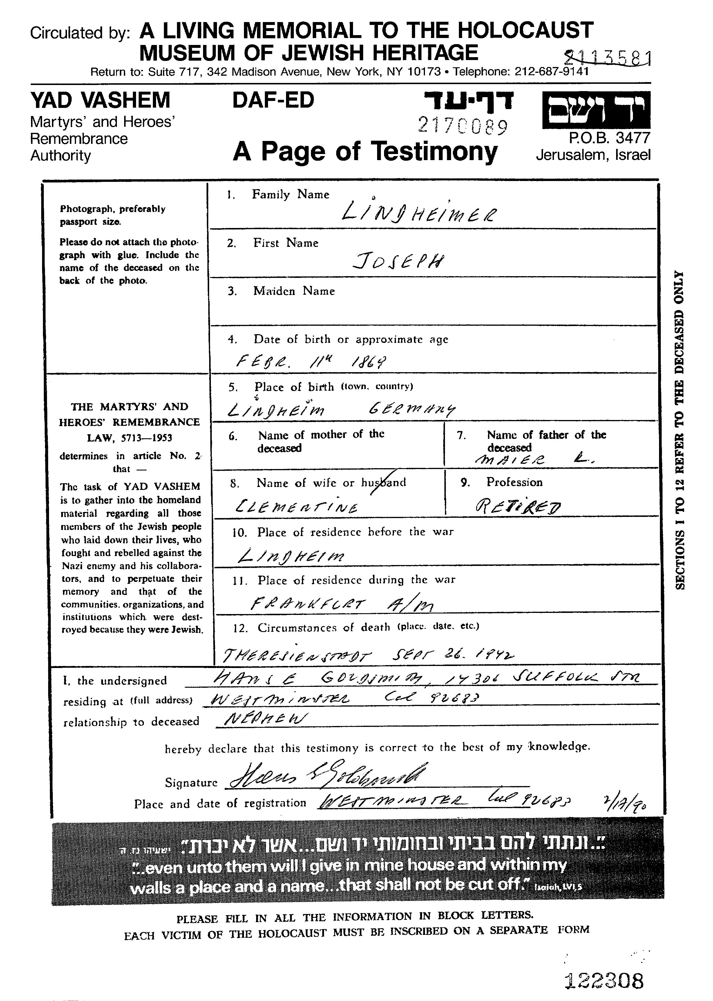 Joseph Lindheimer est né à Lindheim, Allemagne en 1869, fils de Maier. Il était Retraité/e et Mariée à Clementine. Avant la seconde guerre mondiale il vivait à Lindheim, Allemagne. Au cours de la guerre, il était à Frankfurt Main, Allemagne.