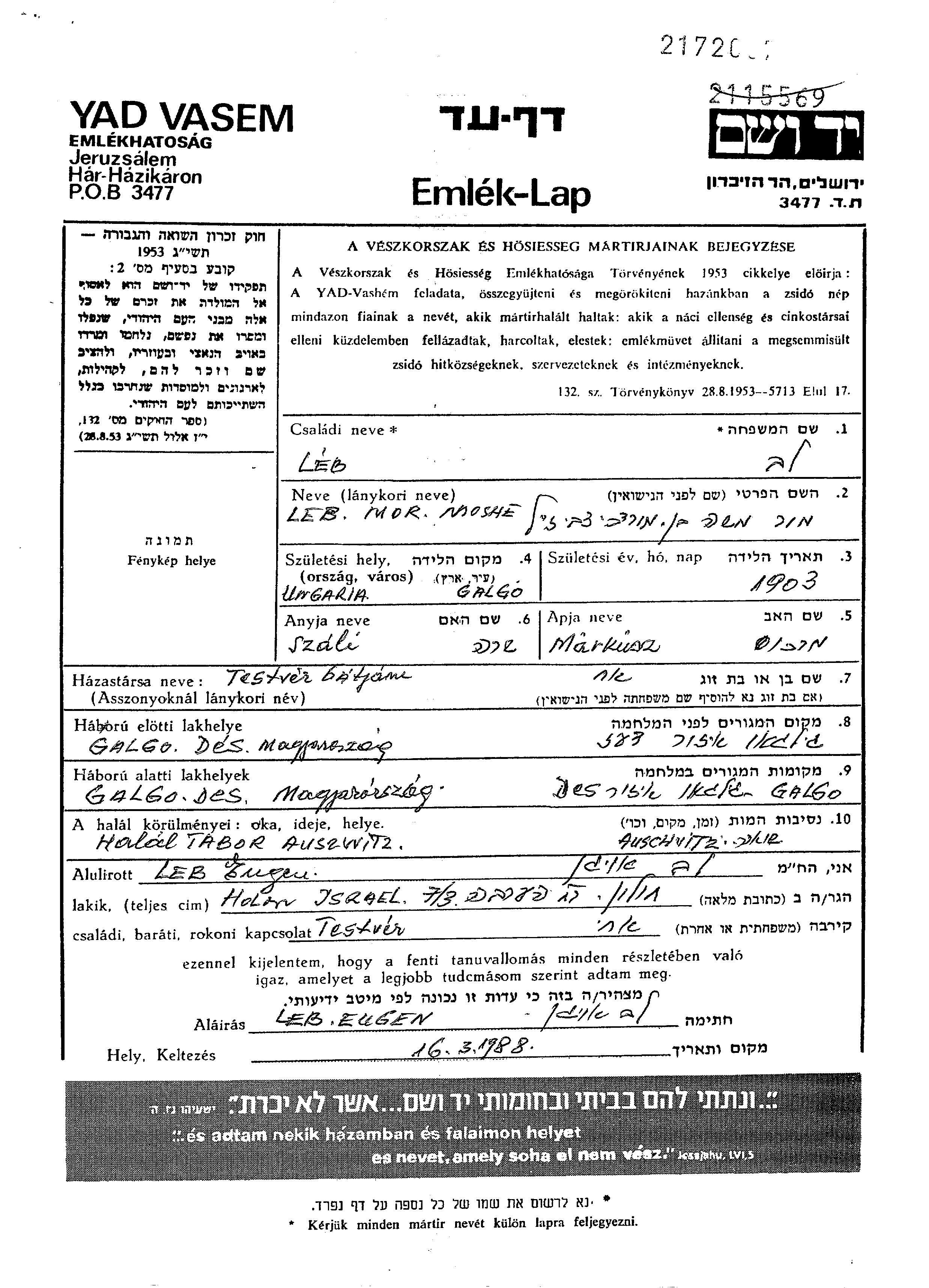 Mor Moshe Leb Lev est né à Galgo, Roumanie en 1903, fils de Markusz Mordekhai et de Szali Sarah Sali. Il était Mariée à Szidonia Szara. Avant la seconde guerre mondiale il vivait à Galgo, Roumanie. Au cours de la guerre, il était à Galgo, Roumanie.