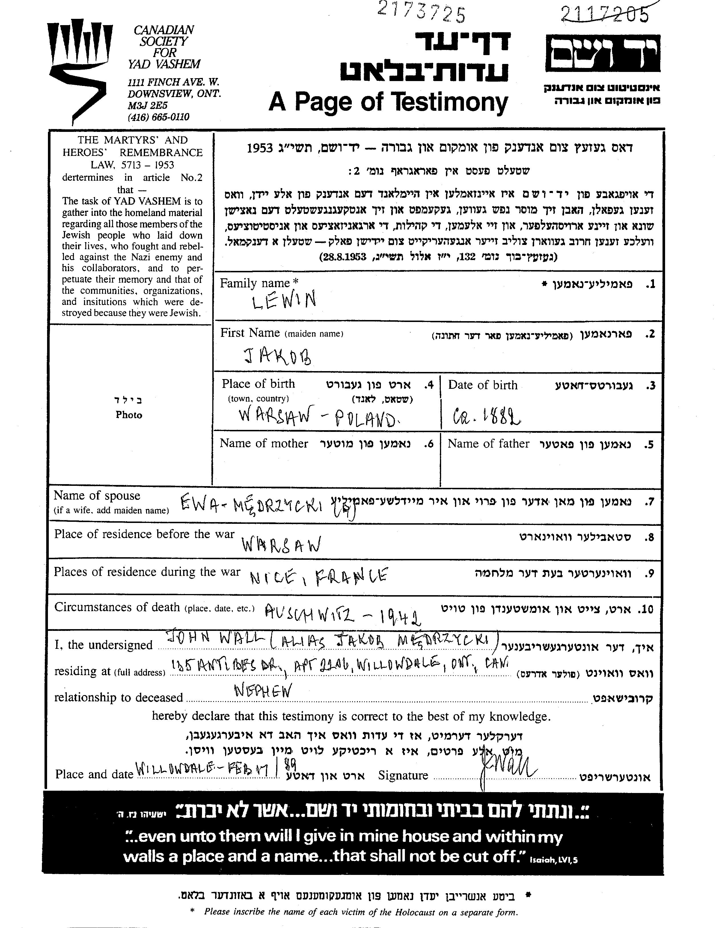 Lewin Jacob 1882 Warszawa, Pologne Feuille de témoignage