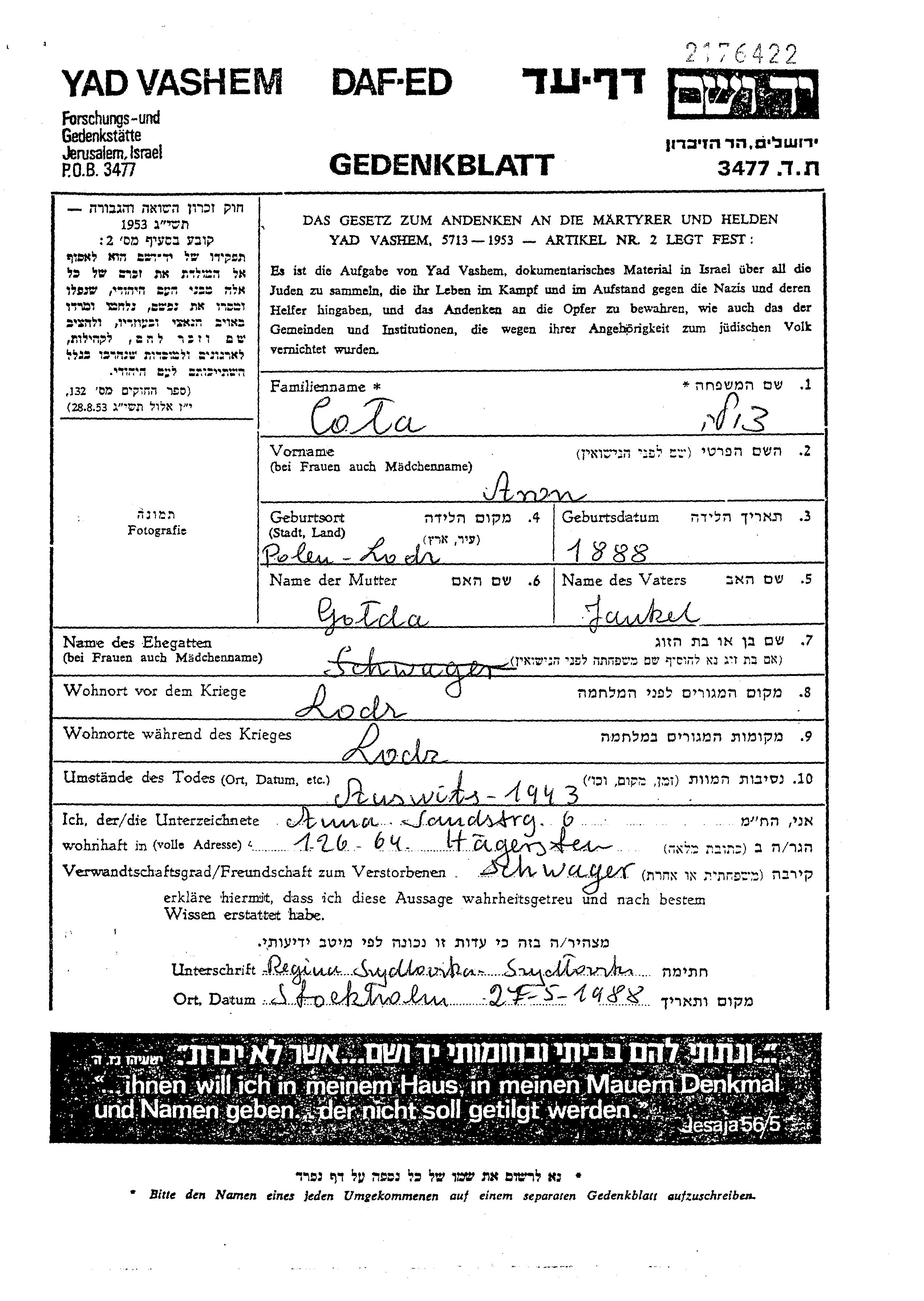 Aron Cola Tzole est né à Lodz, Pologne en 1888, fils de Jankel et de Golda. Il était Mariée à Ester. Avant la seconde guerre mondiale il vivait à Lodz, Pologne. Au cours de la guerre, il était à Lodz, Pologne.