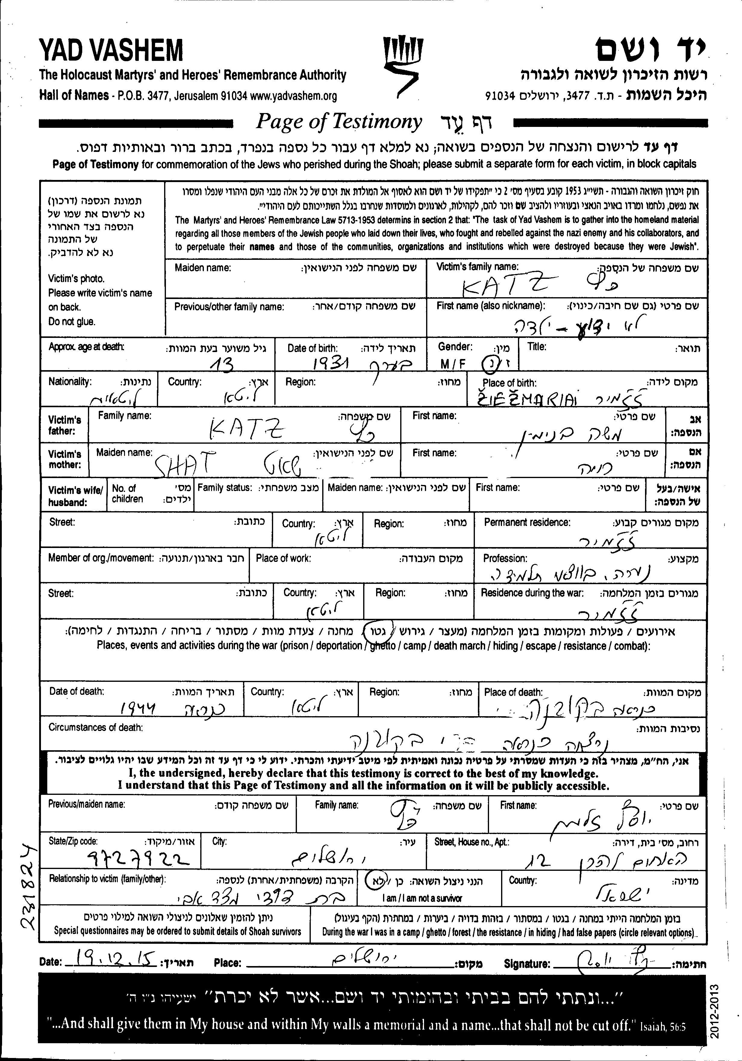 Lieu de résidence pendant la guerre/Shoah