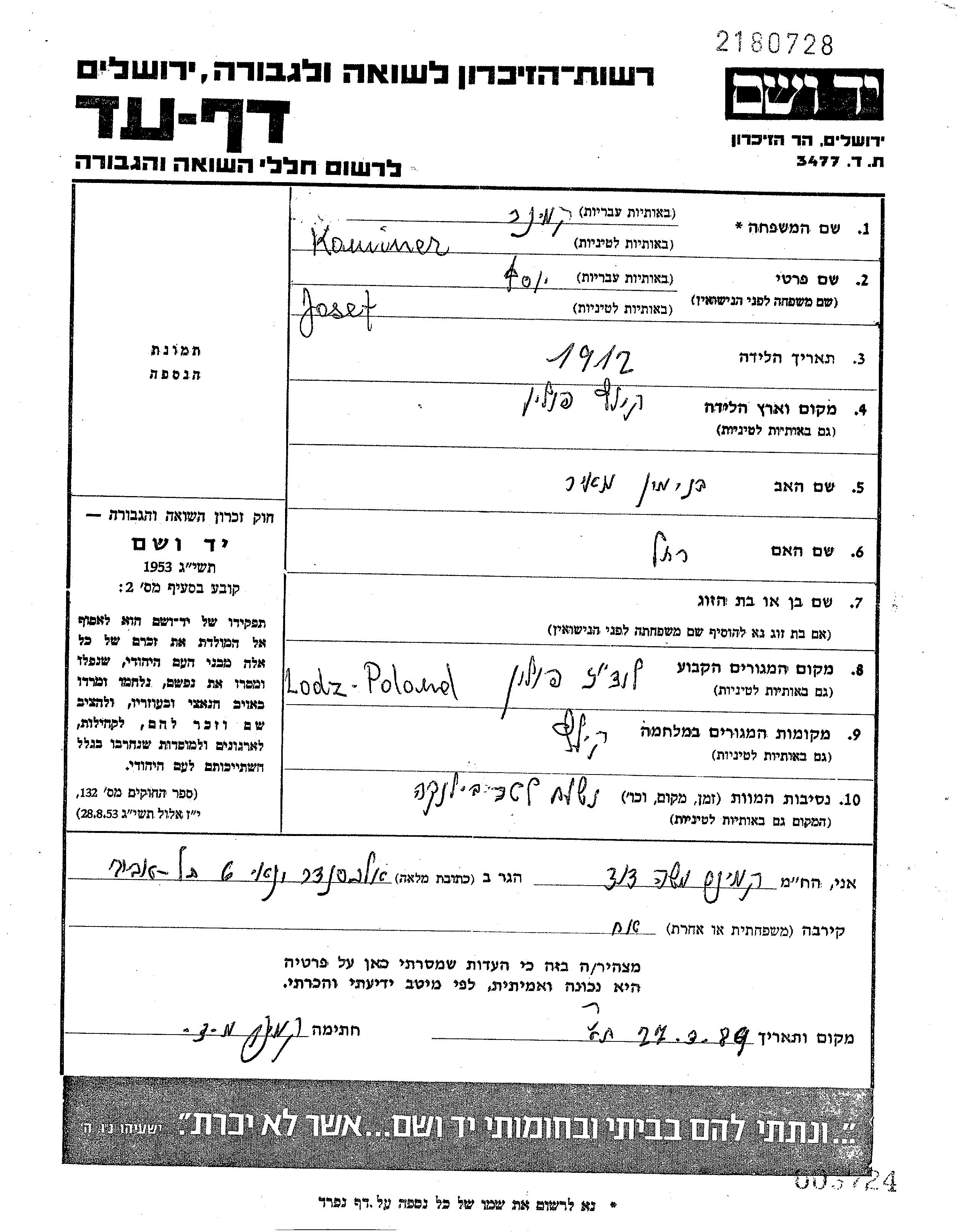 Kaminer Josef 1912 Lodz, Pologne Feuille de témoignage