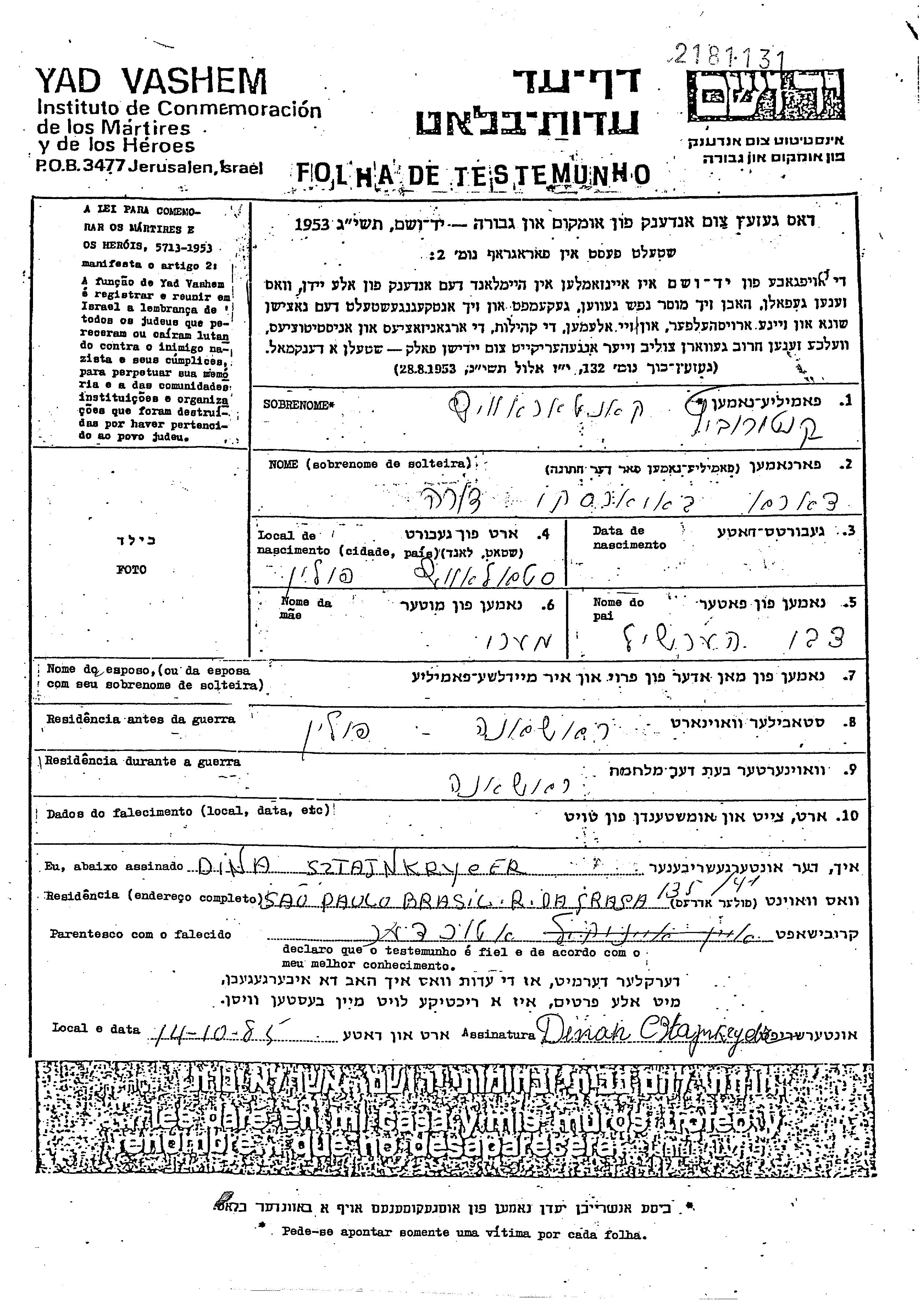Yad Vashem - Pages of Testimony Names Memorial Collection