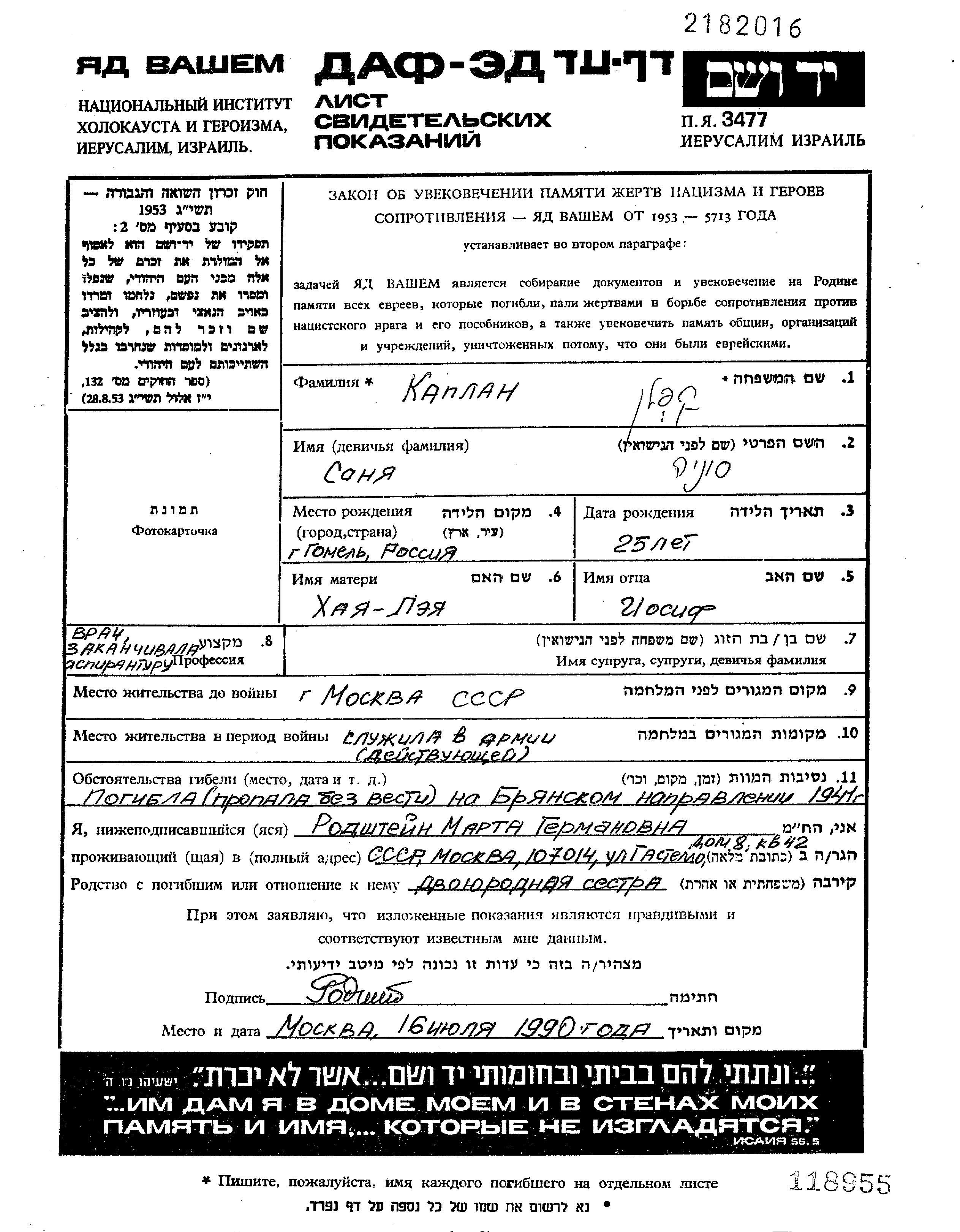 Kaplan Sonya Moskva, Russie (URSS) Feuille de témoignage