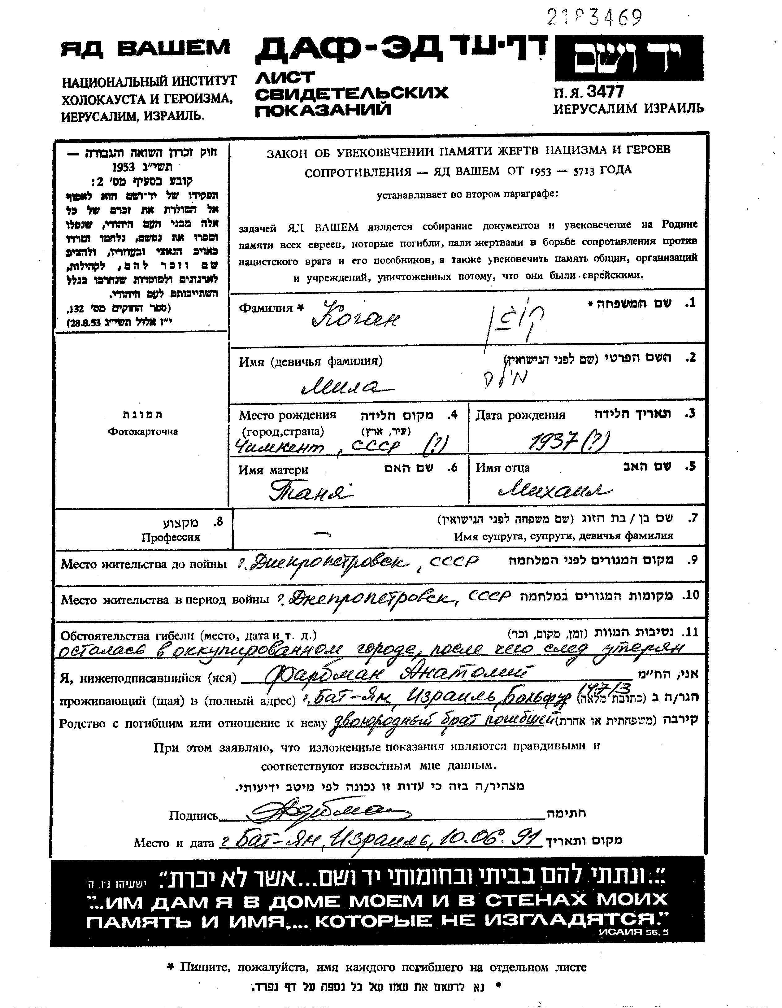 Kogan Mila 1937 Dnepropetrovsk, Ukraine (URSS) Feuille de témoignage