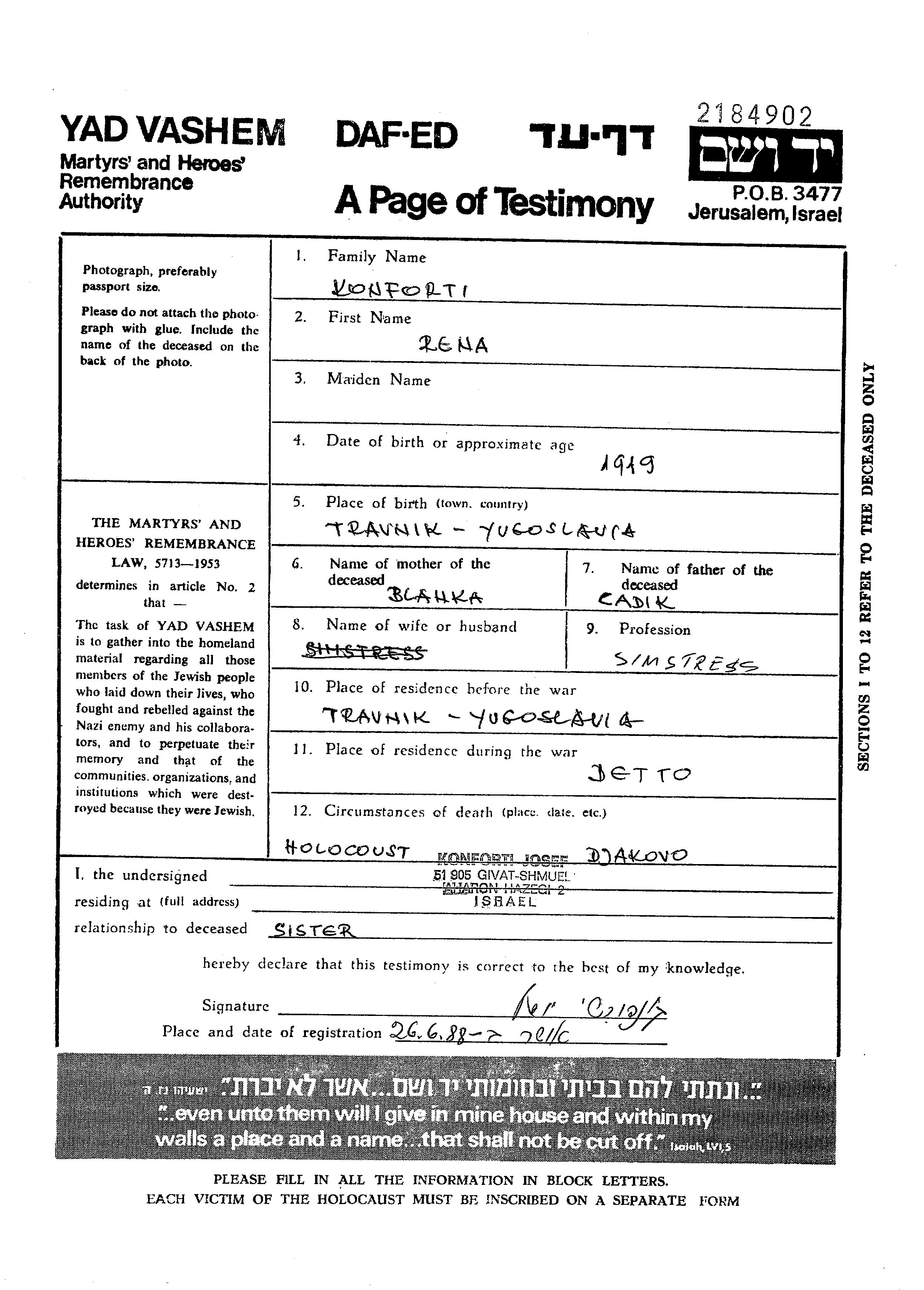 Rena Rene Konforti est née à Travnik, Yugoslavie en 1919, fille de Cadik et de Blanka. Elle était Couturière. Avant la seconde guerre mondiale elle vivait à Travnik, Yugoslavie. Pendant la guerre, elle était à Travnik, Yugoslavie.