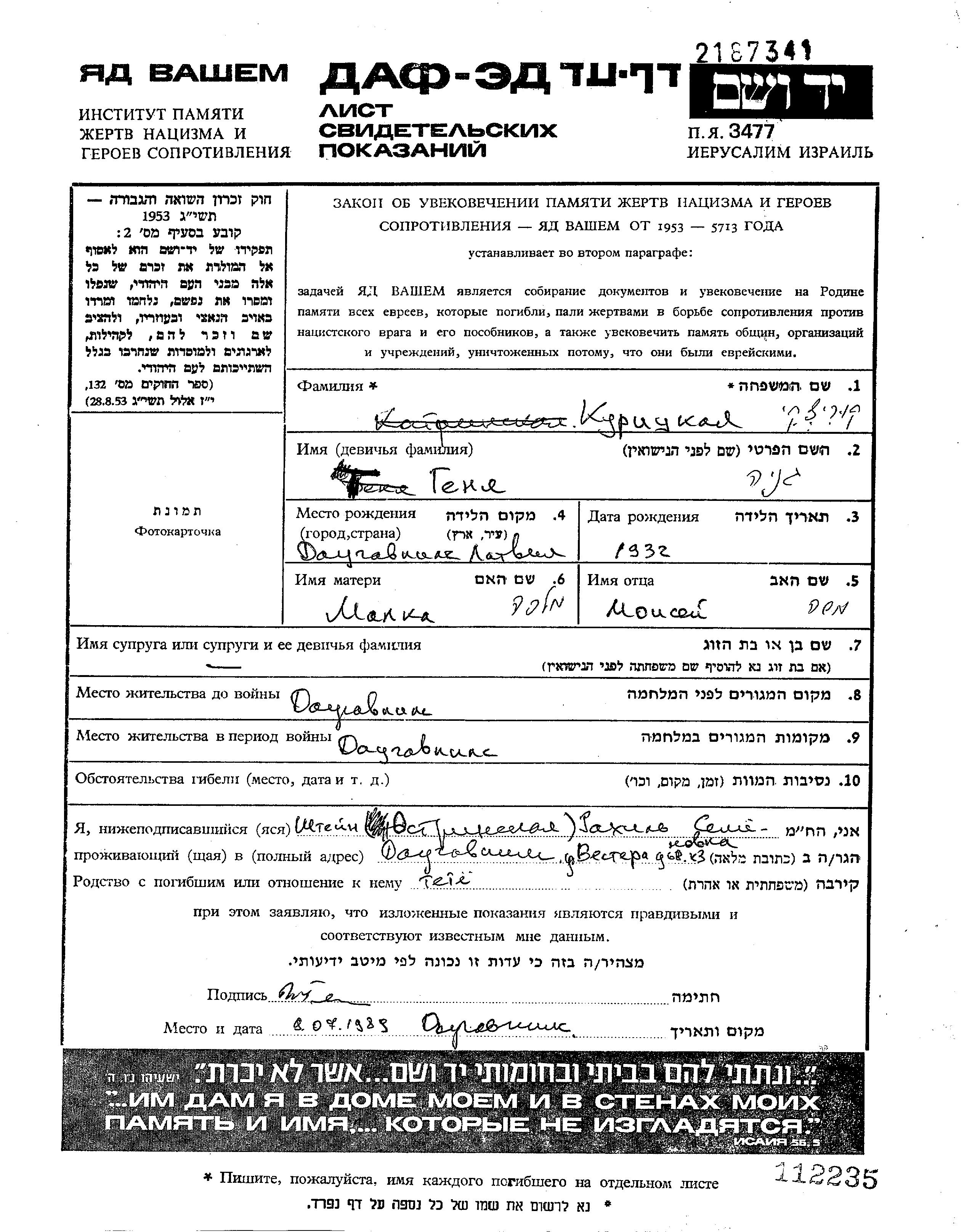 Kuritzki Genya 1932 Daugavpils, Lettonie Feuille de témoignage