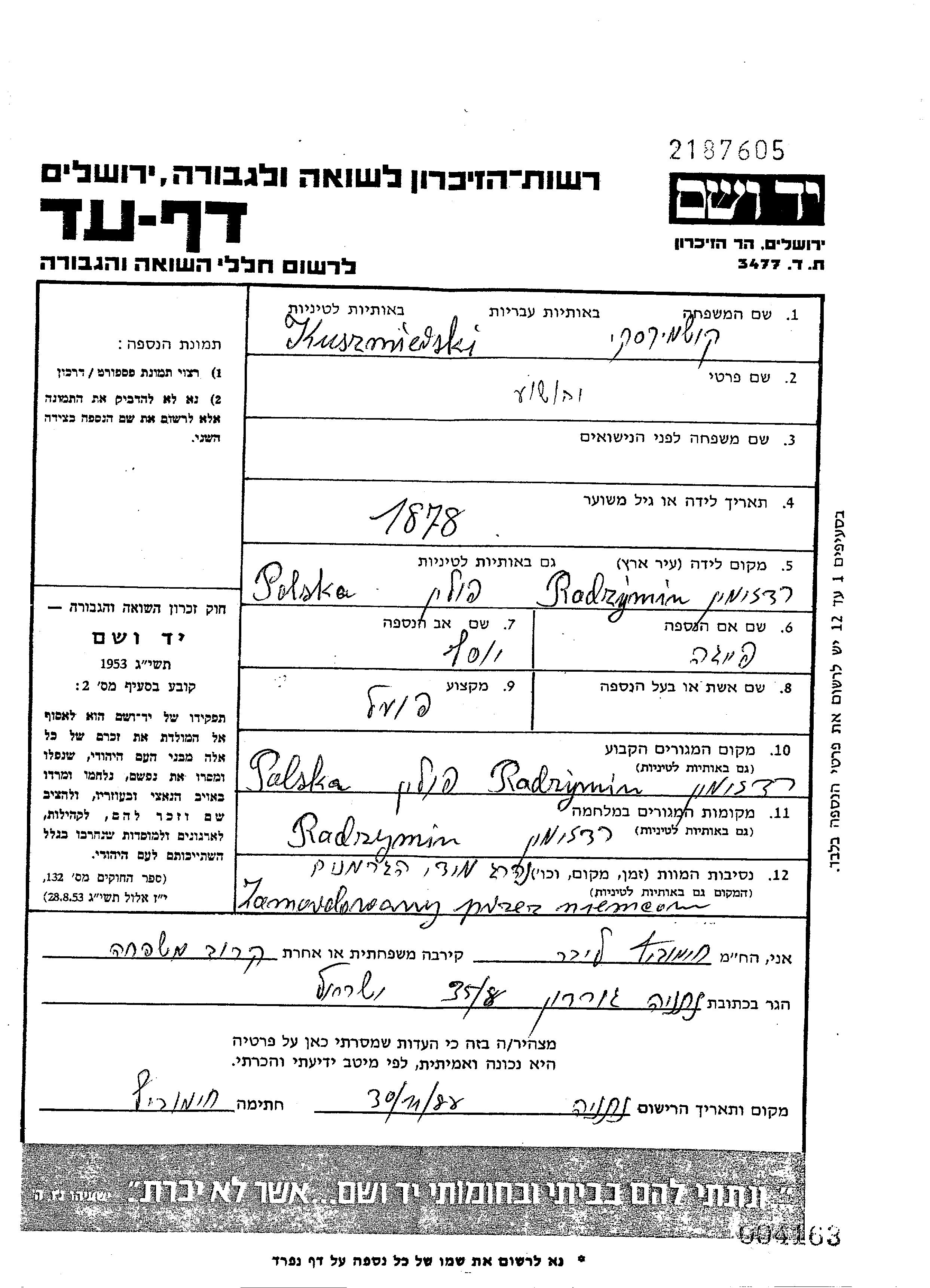 Kuszmierski Yehoshua 1878 Radzymin, Pologne Feuille de témoignage