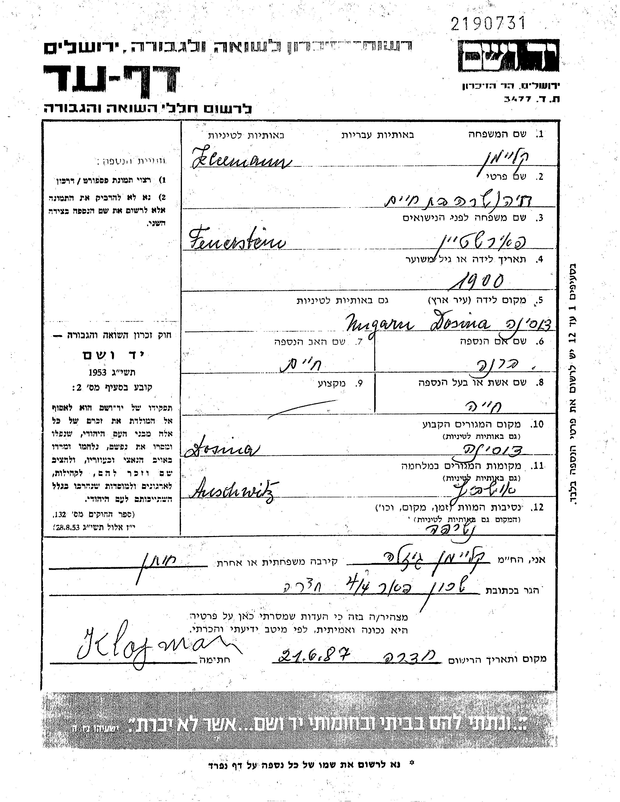 Kleimann Sara Khaia 1900 Duszina, Tchécoslovaquie Feuille de témoignage