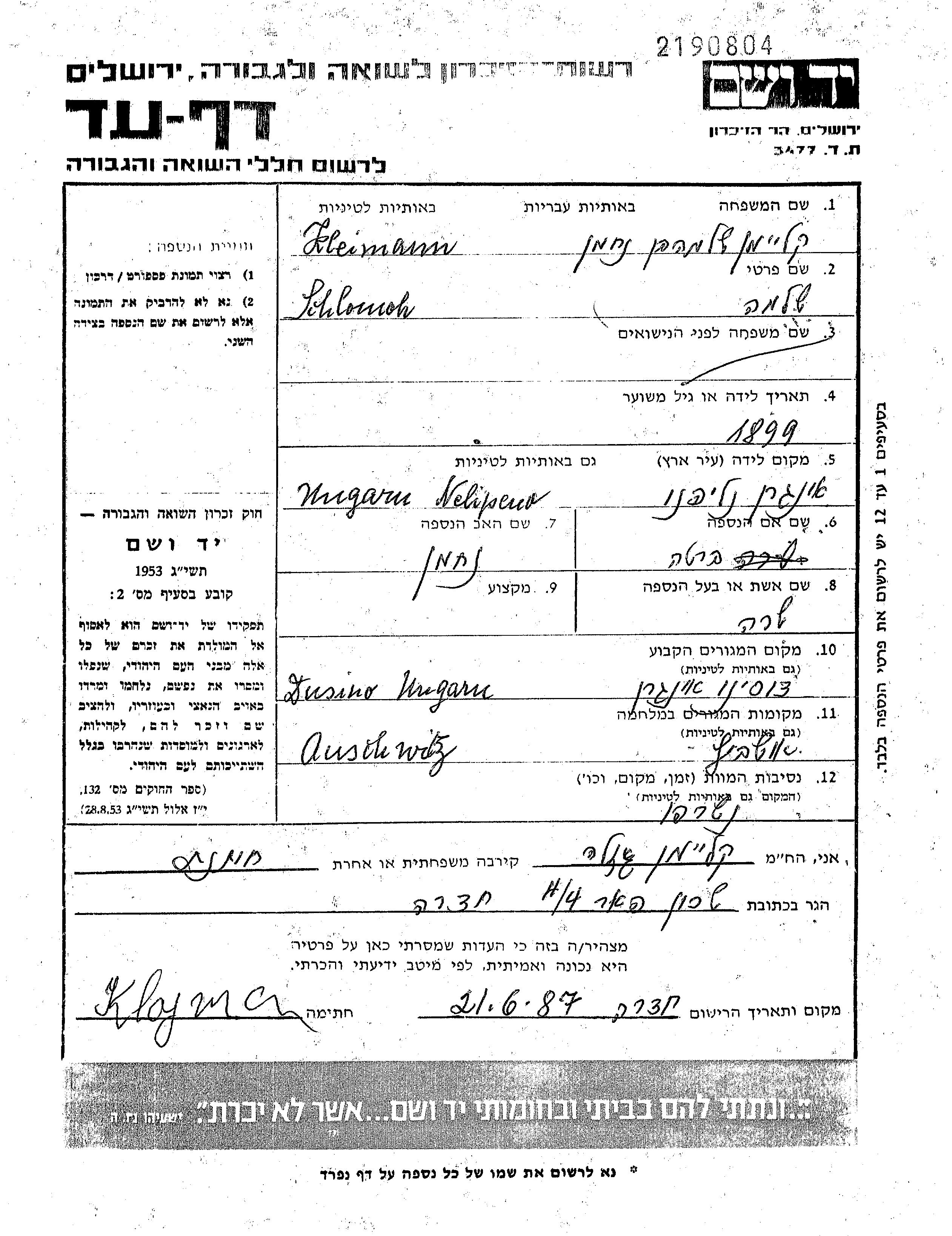 Kleimann Shlomoh 1899 Duszina, Tchécoslovaquie Feuille de témoignage