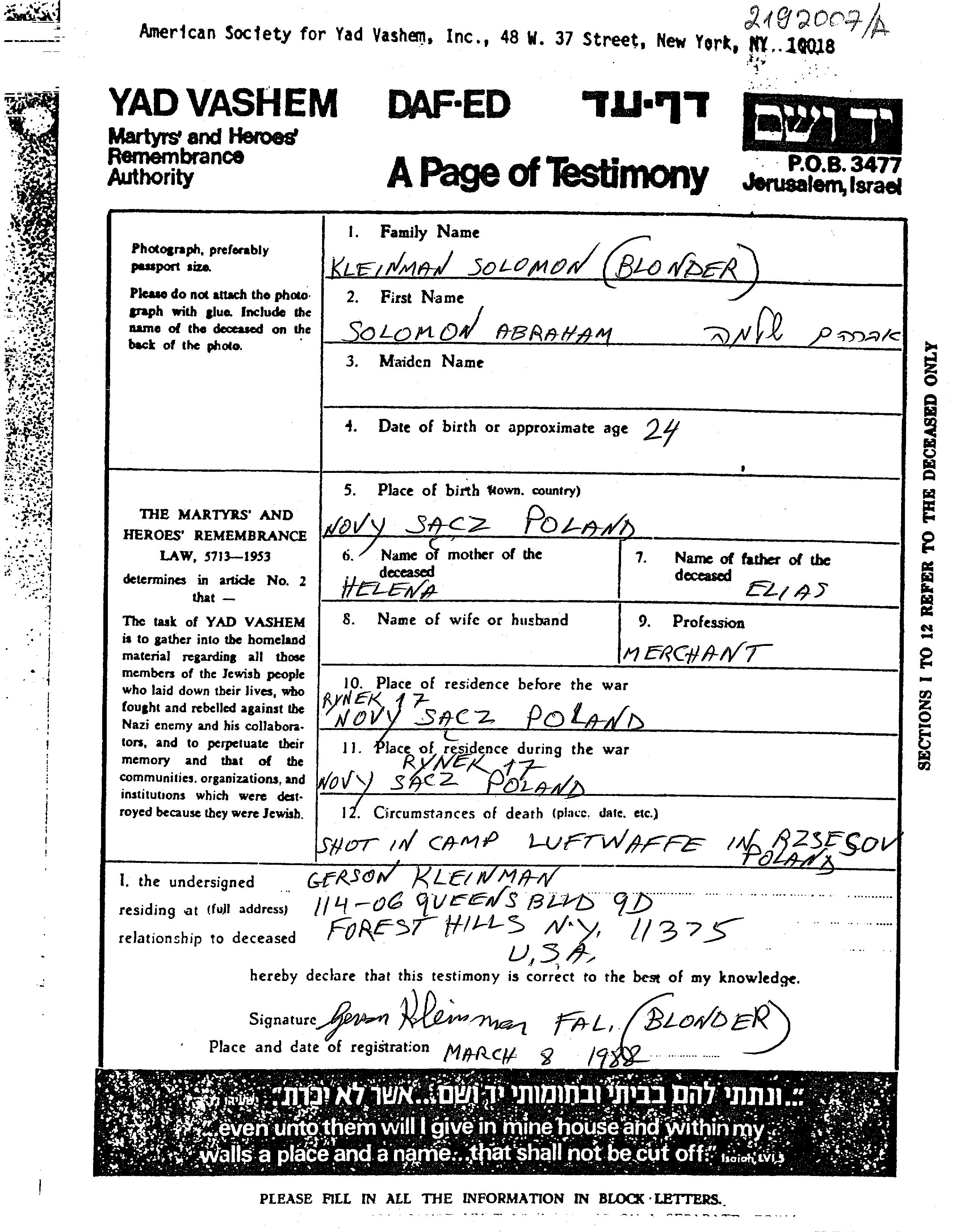 Blonder Kleinman Solomon Avraham 1920 Nowy Sącz, Pologne Feuille de témoignage
