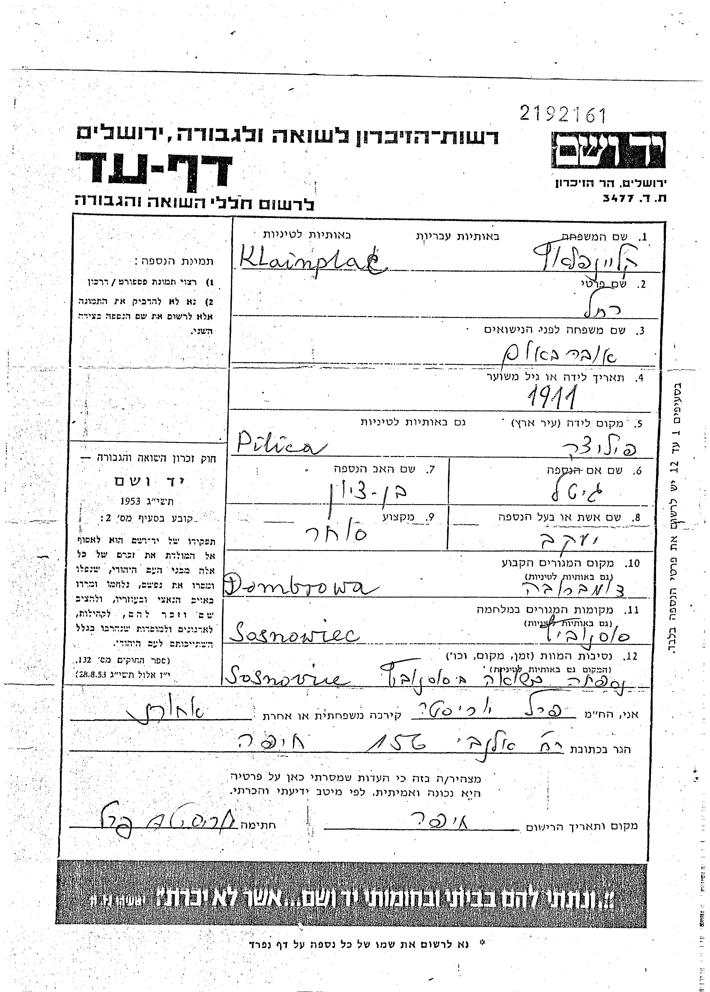 Klainplac Rakhel 1911 Dombrovo, Pologne Feuille de témoignage