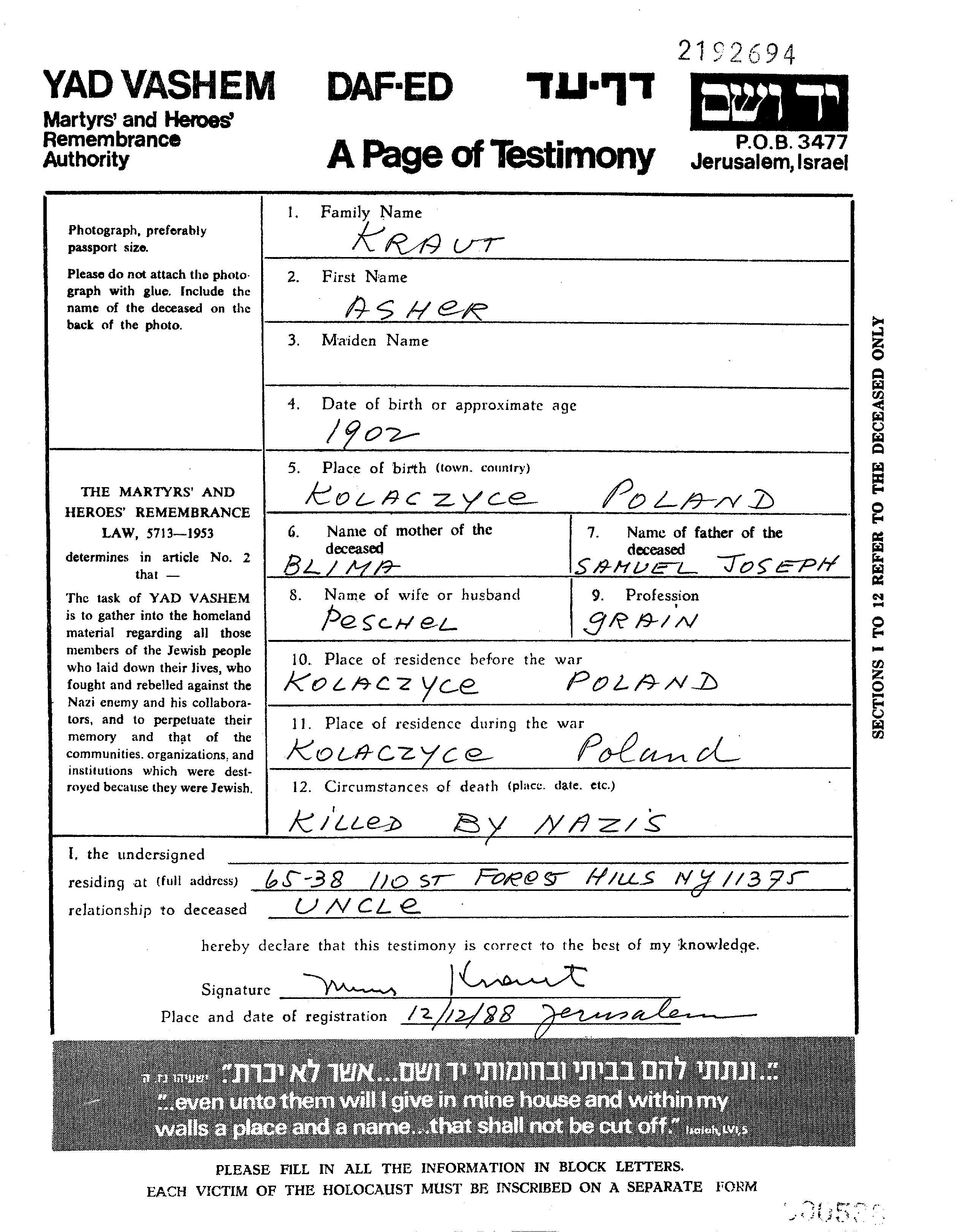 Asher Kraut est né à Kolaczyce, Pologne en 1902, fils de Joseph Shmuel et de Blima. Il était Négociant en grain et Mariée à Peschel Peshel. Avant la seconde guerre mondiale il vivait à Kolaczyce, Pologne. Au cours de la guerre, il était à Kolaczyce, Pologne.
