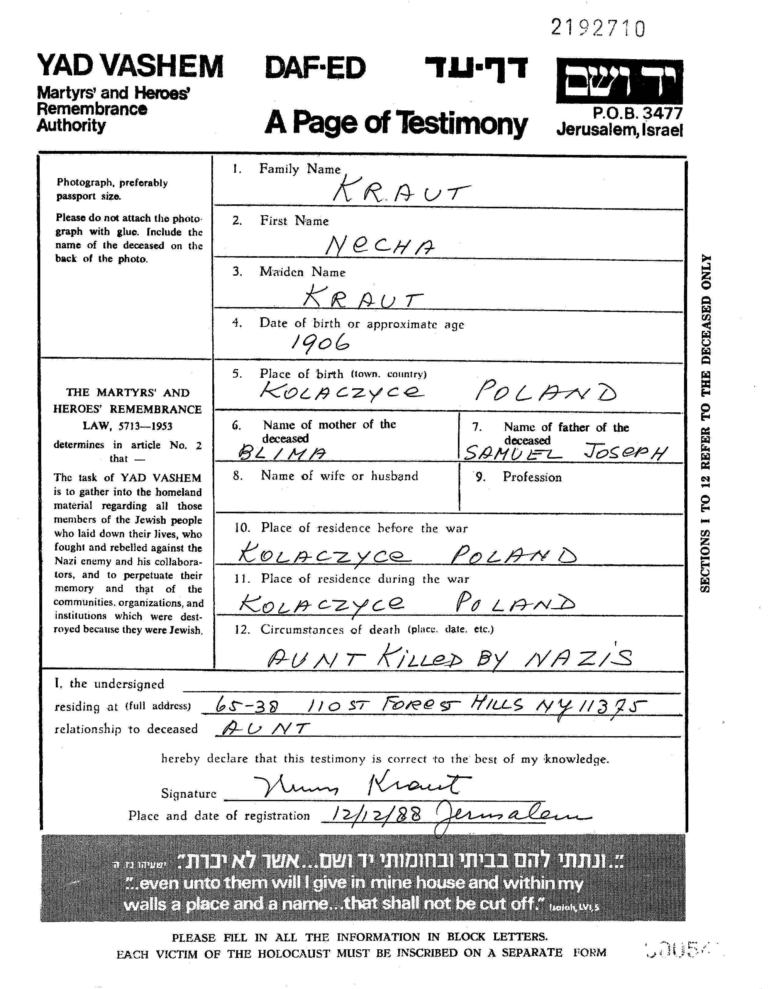 Necha Kraut est née à Kolaczyce, Pologne en 1906, fille de Joseph Shmuel et de Blima. Avant la seconde guerre mondiale elle vivait à Kolaczyce, Pologne. Pendant la guerre, elle était à Kolaczyce, Pologne.