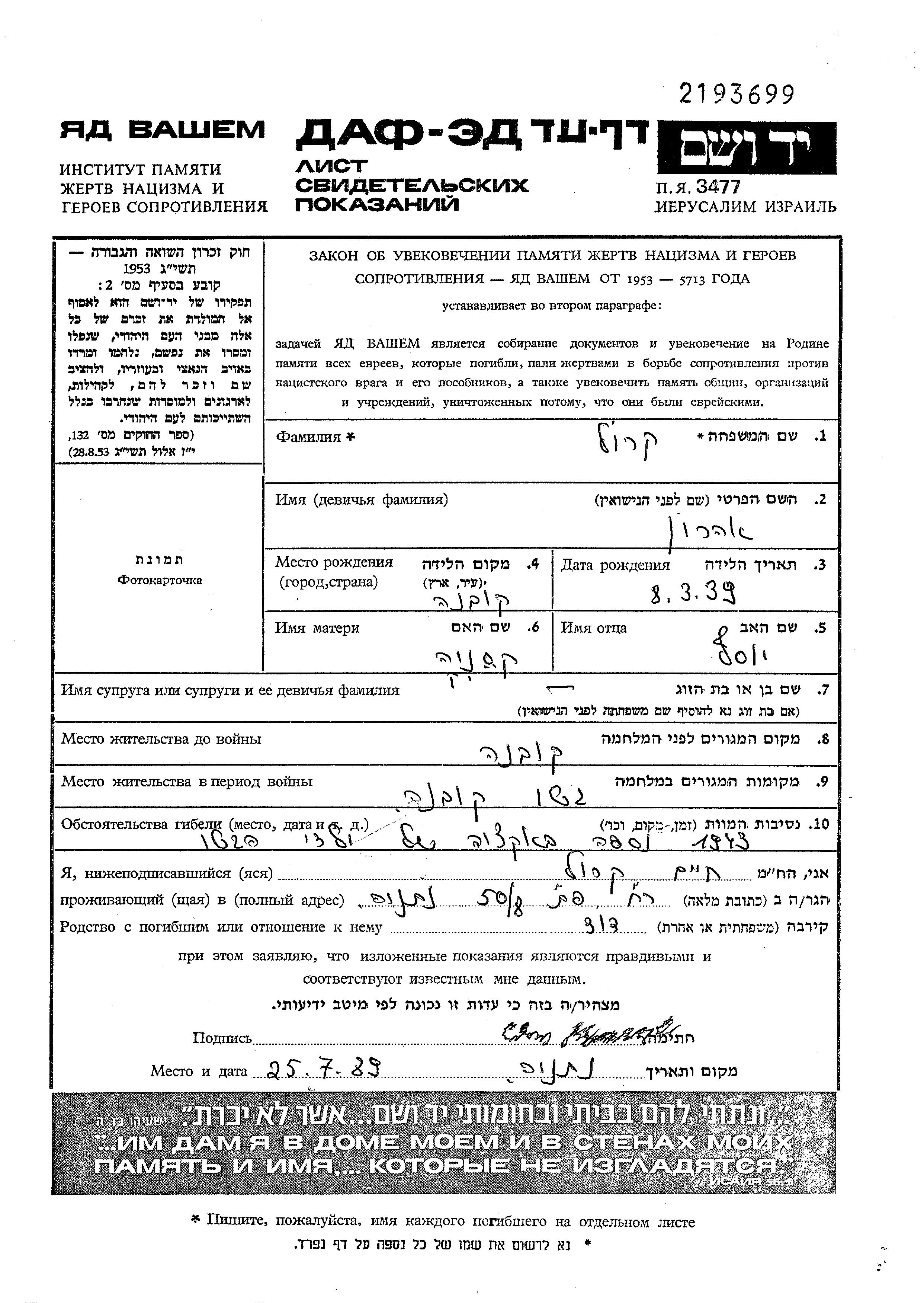 Krol Aharon 1939 Kowno, Lituanie Feuille de témoignage