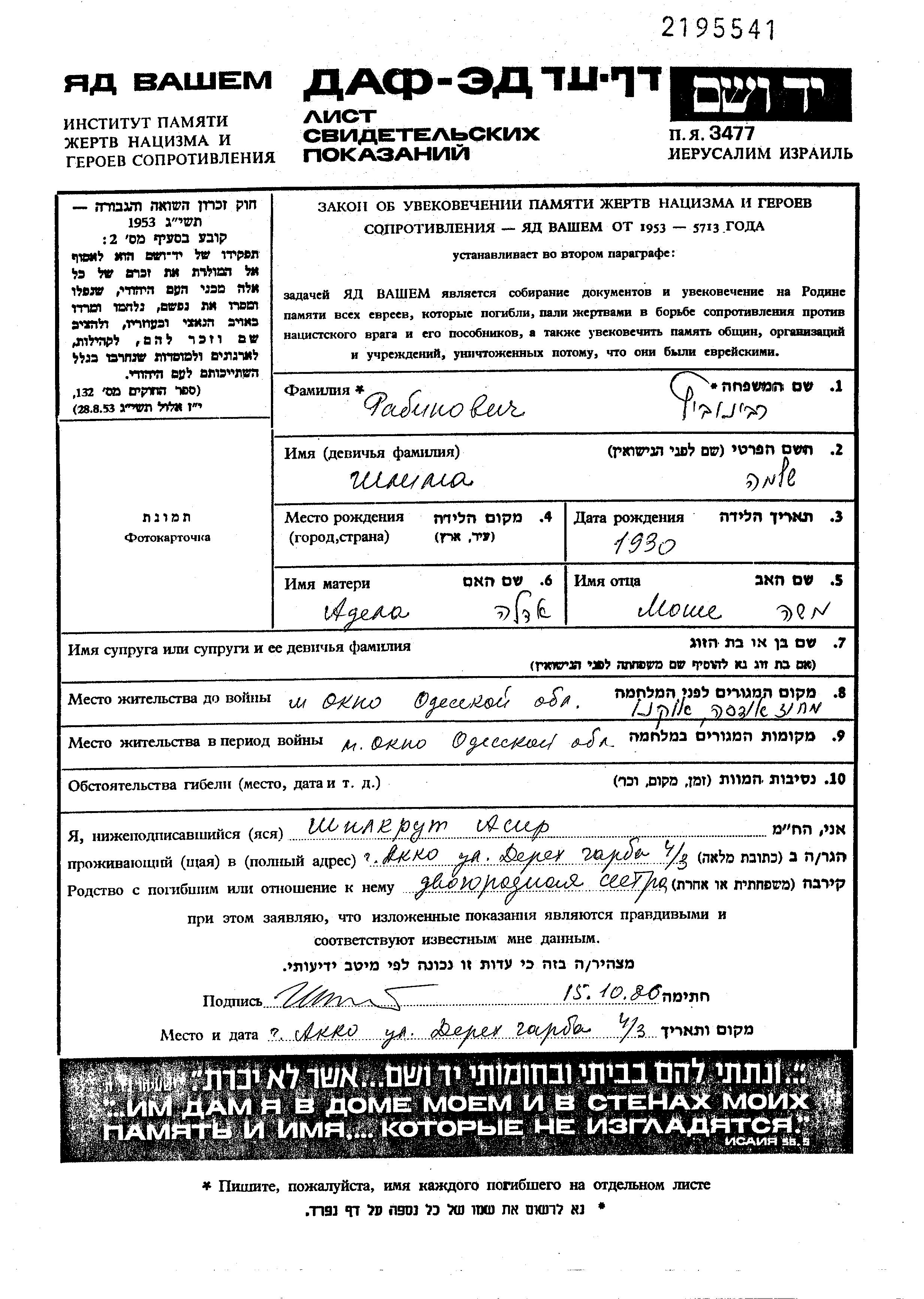 Rabinovich Shlima 1930 Okno, Pologne Feuille de témoignage