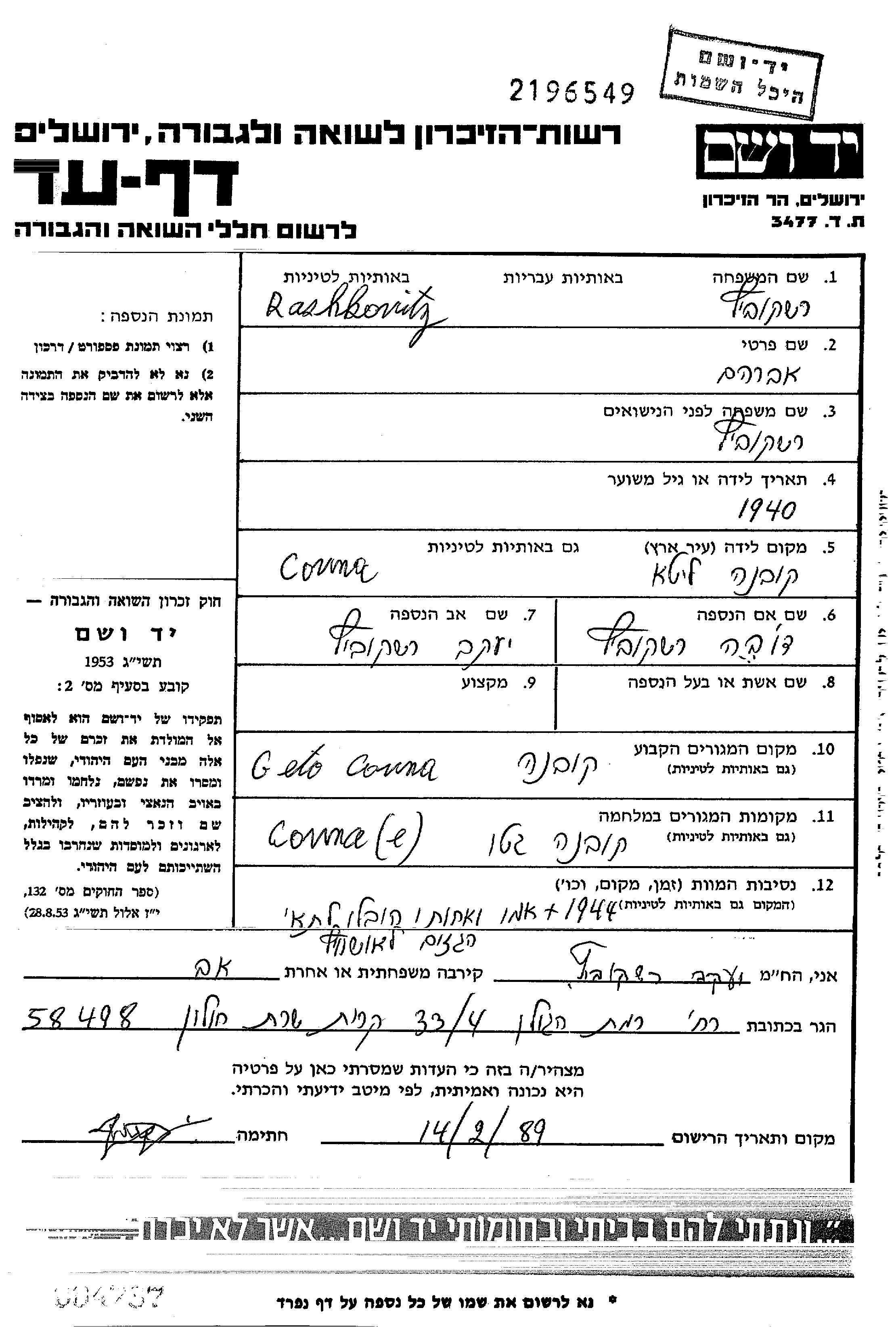 Rashkovitz Avraham 1940 Kowno, Lituanie Feuille de témoignage