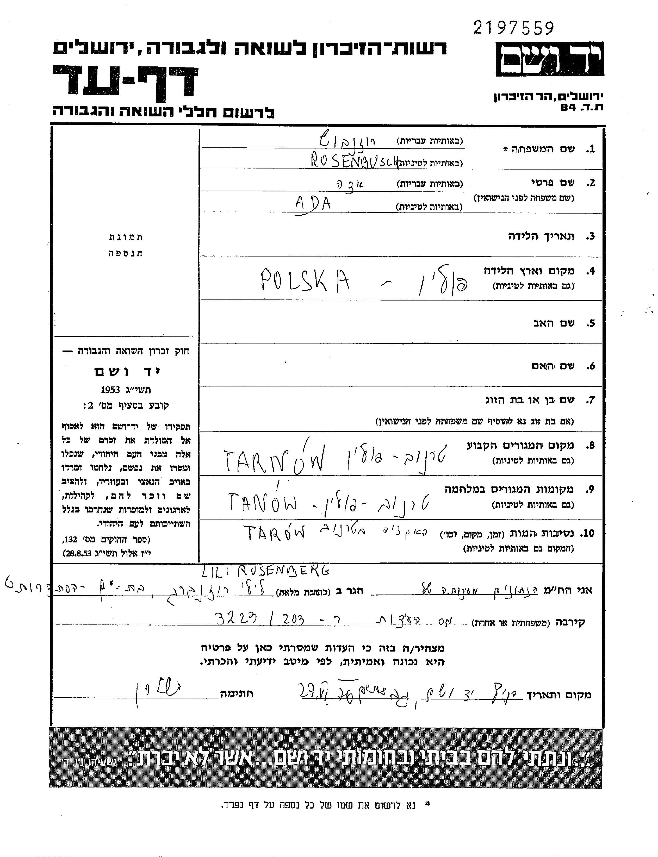 Rosenbusch Ede Ada Tarnow, Pologne Feuille de témoignage