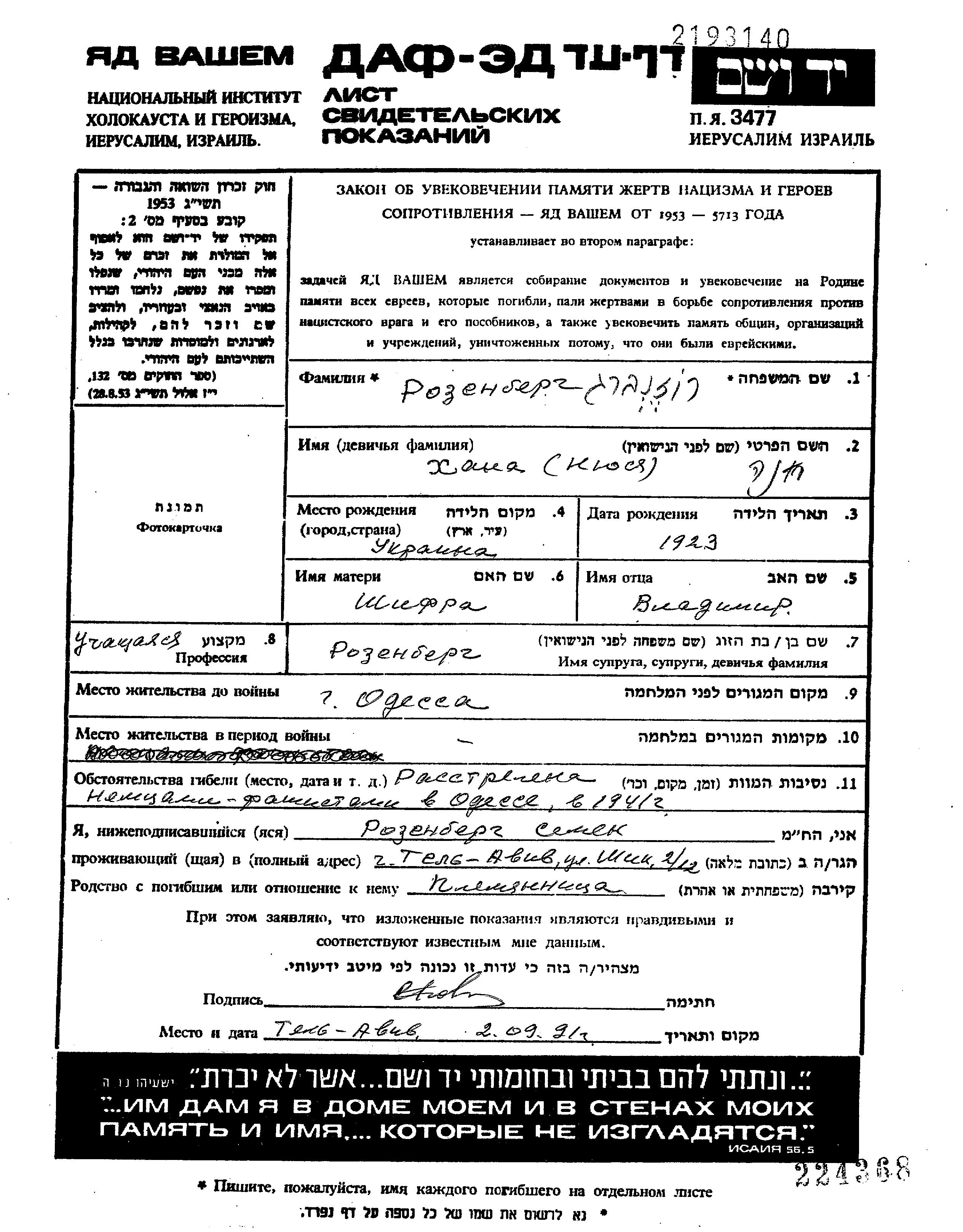 Rozenberg Nyusya Khana 1923 Odessa, Ukraine (URSS) Feuille de témoignage