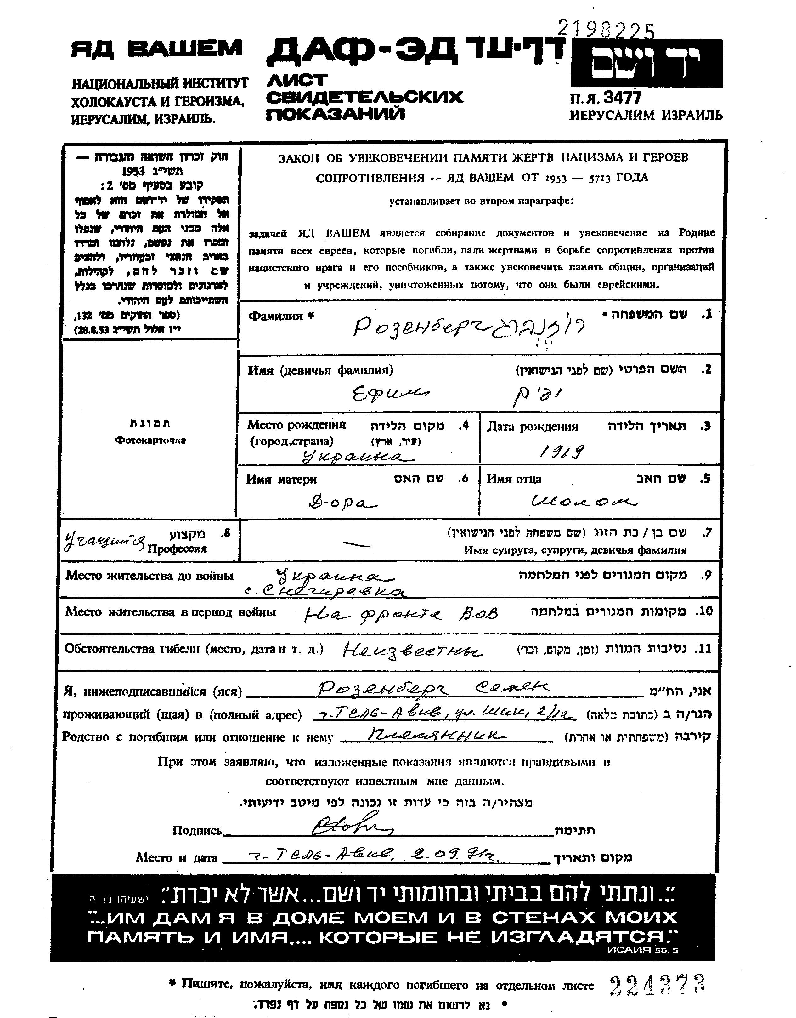 Yefim Rozenberg est né à Ukraine (URSS) en 1919, fils de Sholom et de Dora. Il était Étudiant/e. Avant la seconde guerre mondiale il vivait à Snigirevka, Ukraine (URSS). Au cours de la guerre, il était à the Soviet armed forces. Yefim a été tué en tant que militaire pendant la Seconde Guerre mondiale.