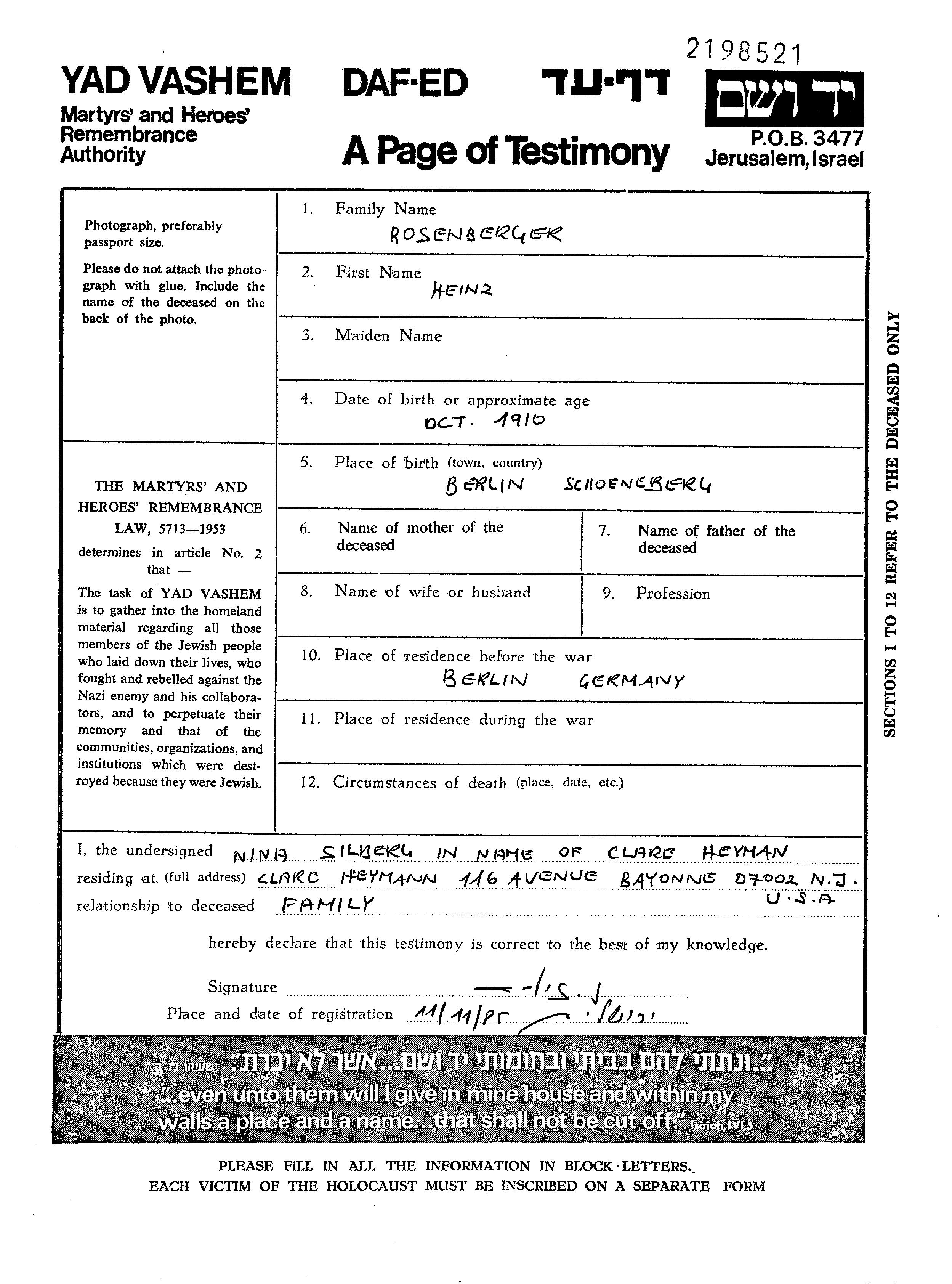 Rosenberger Heinz 1910 Berlin, Allemagne Feuille de témoignage