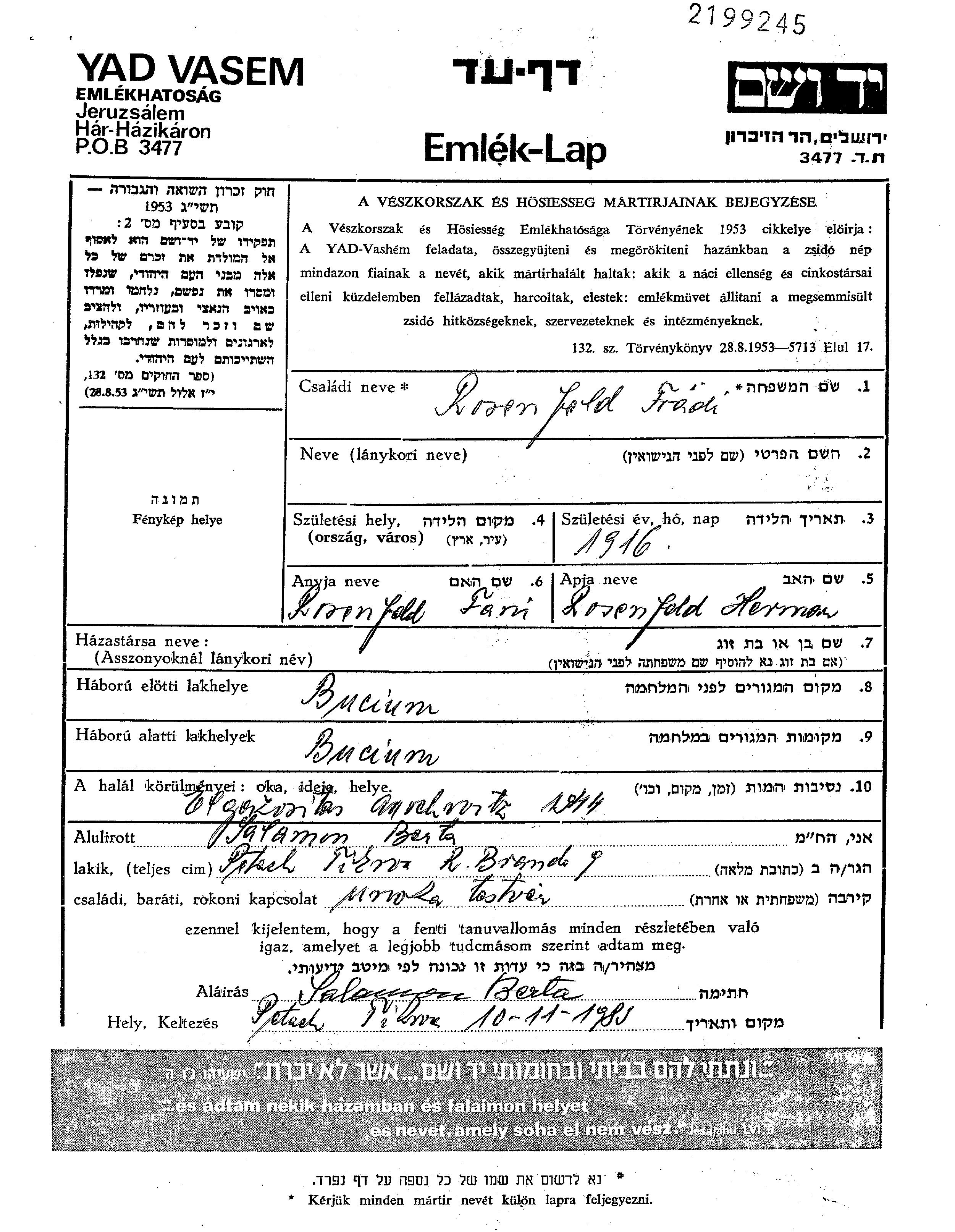 Fradi Rosenfeld est née en 1916, fille de Herman et de Fani. Avant la seconde guerre mondiale elle vivait à Buciumi, Roumanie. Pendant la guerre, elle était à Buciumi, Roumanie.