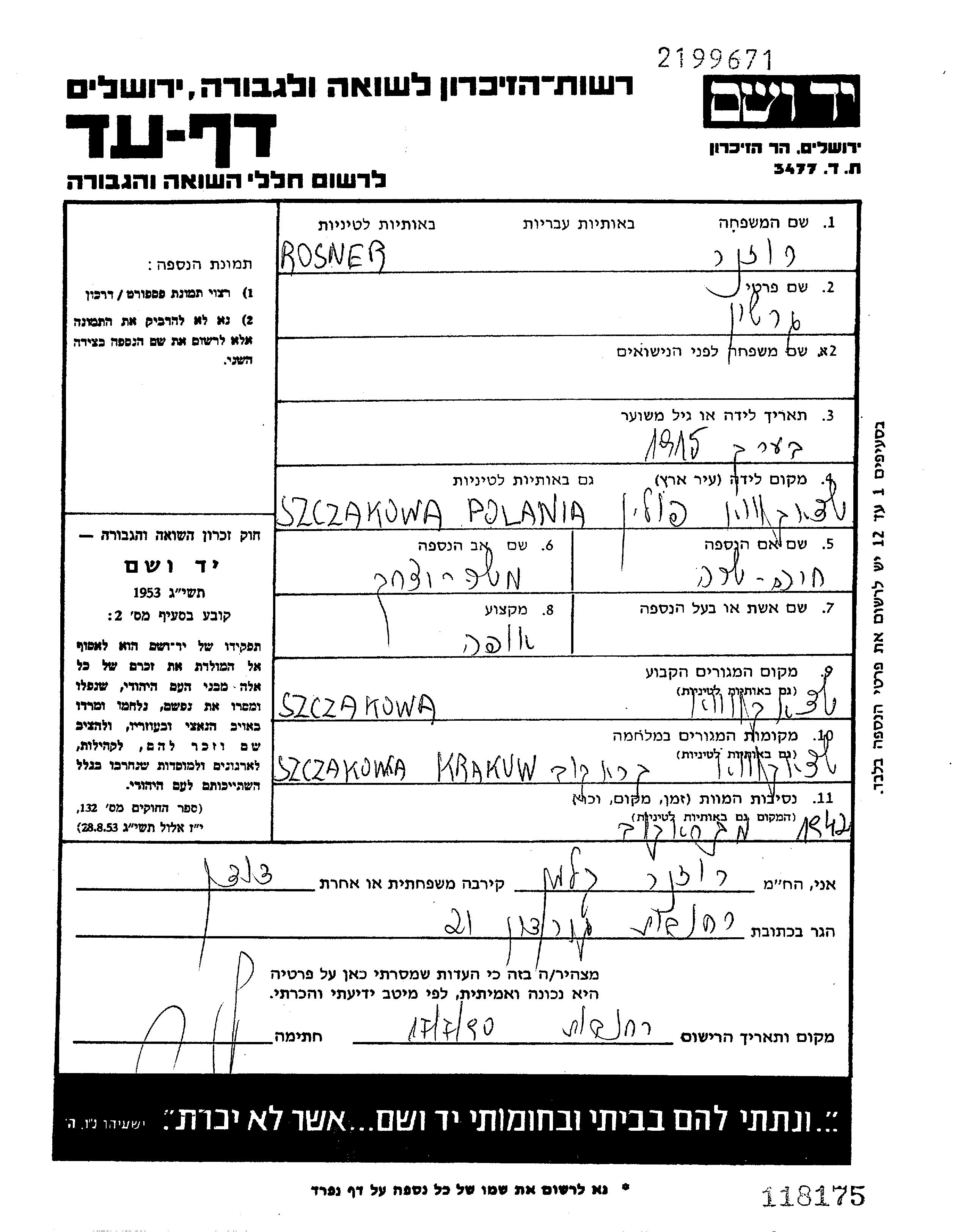 Rosner Gershon 1915 Szczakowa, Pologne Feuille de témoignage