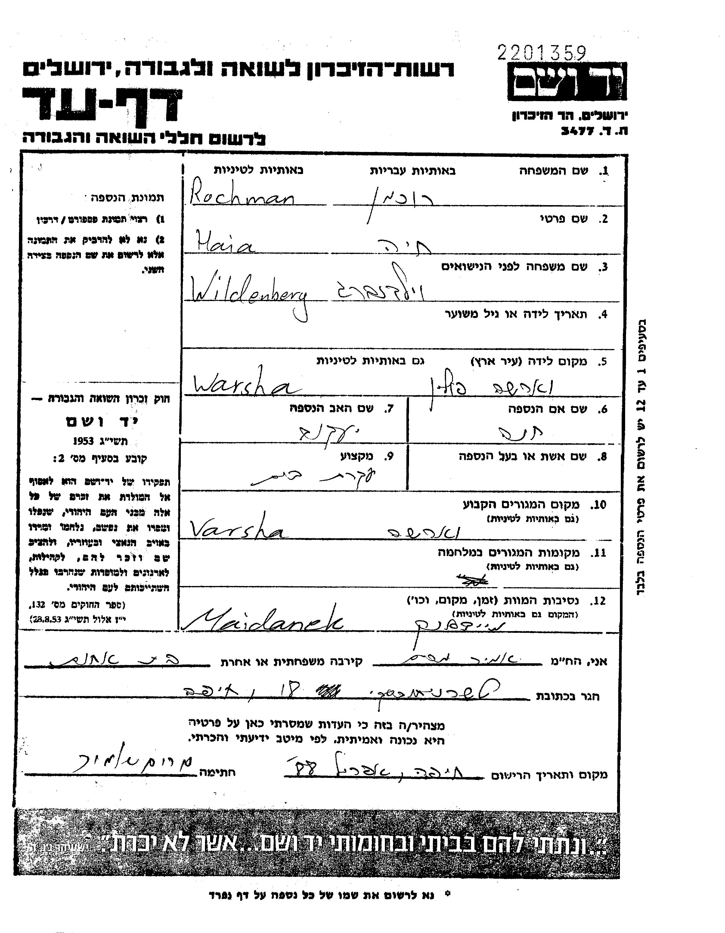 Haia Rochman née Wildenberg est née à Warszawa, Pologne, fille de Jakow et de Hana. Elle était Femme au foyer et Mariée. Avant la seconde guerre mondiale elle vivait à Warszawa, Pologne.