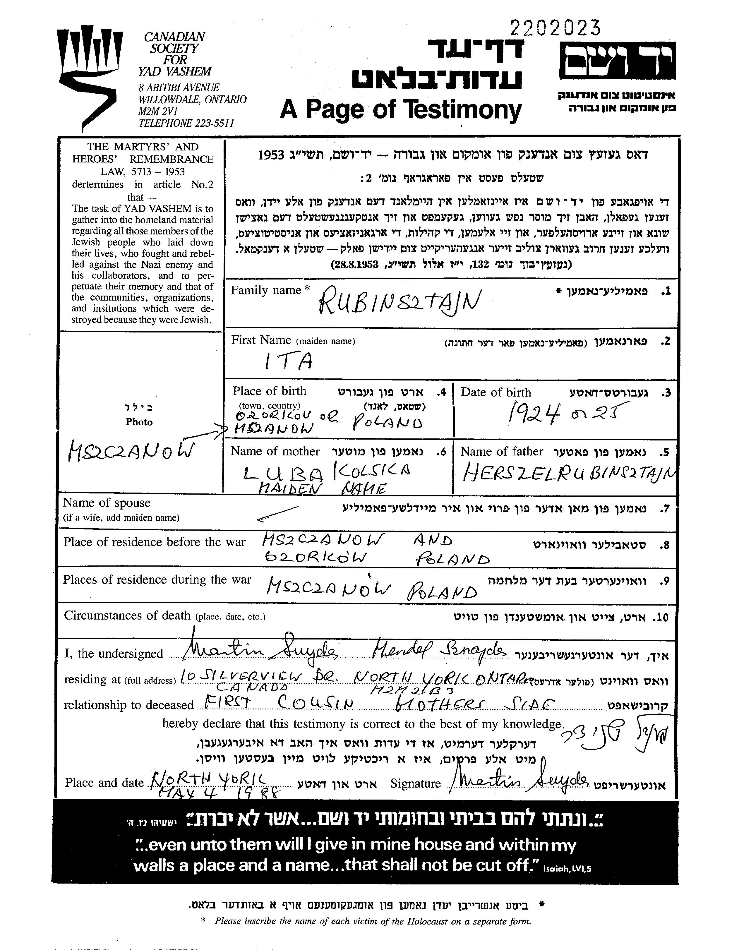 Rubinsztajn Ita 1924 Ozorkow, Pologne Feuille de témoignage