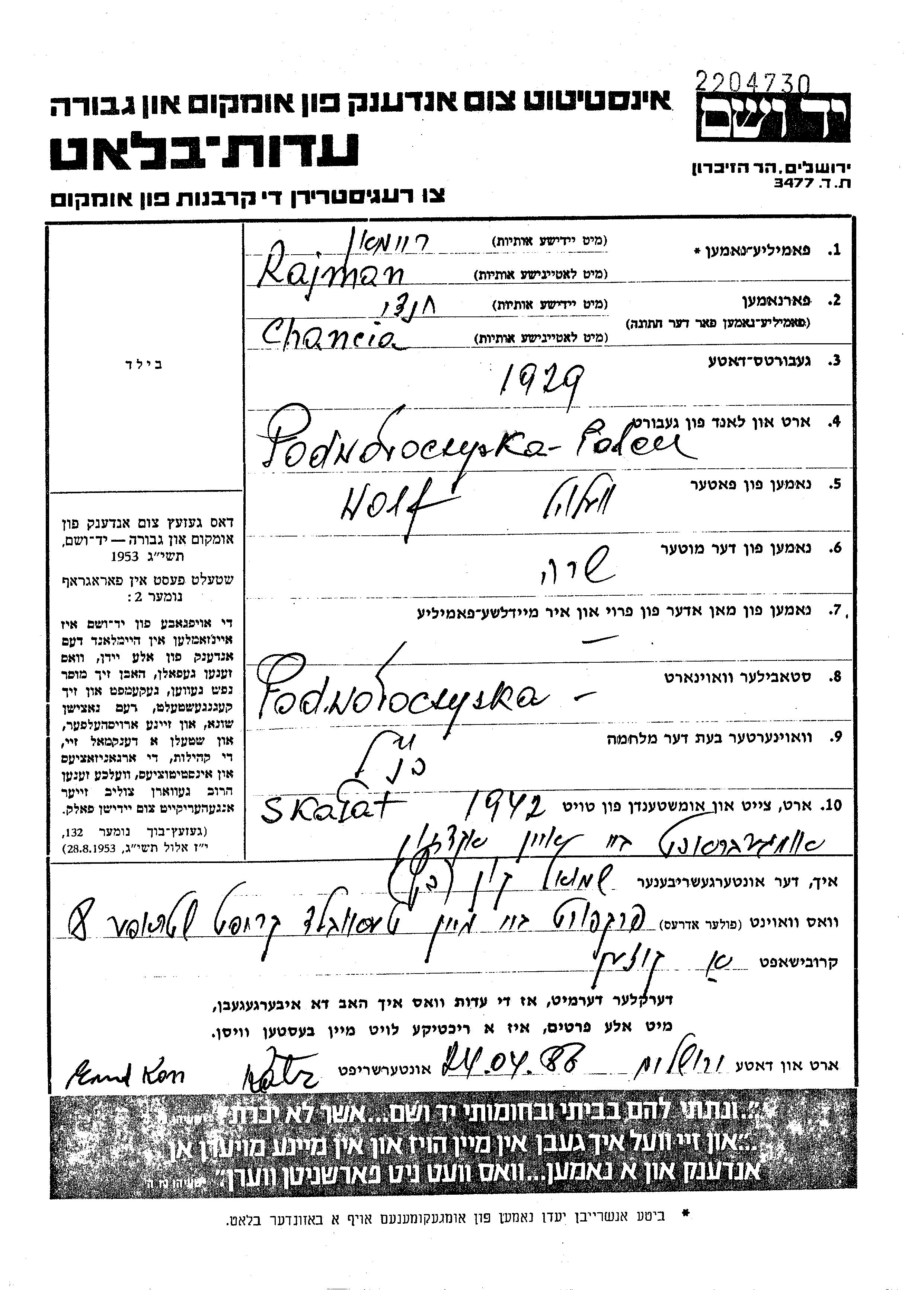 Rajman Chancia 1929 Podwoloczyska, Pologne Feuille de témoignage
