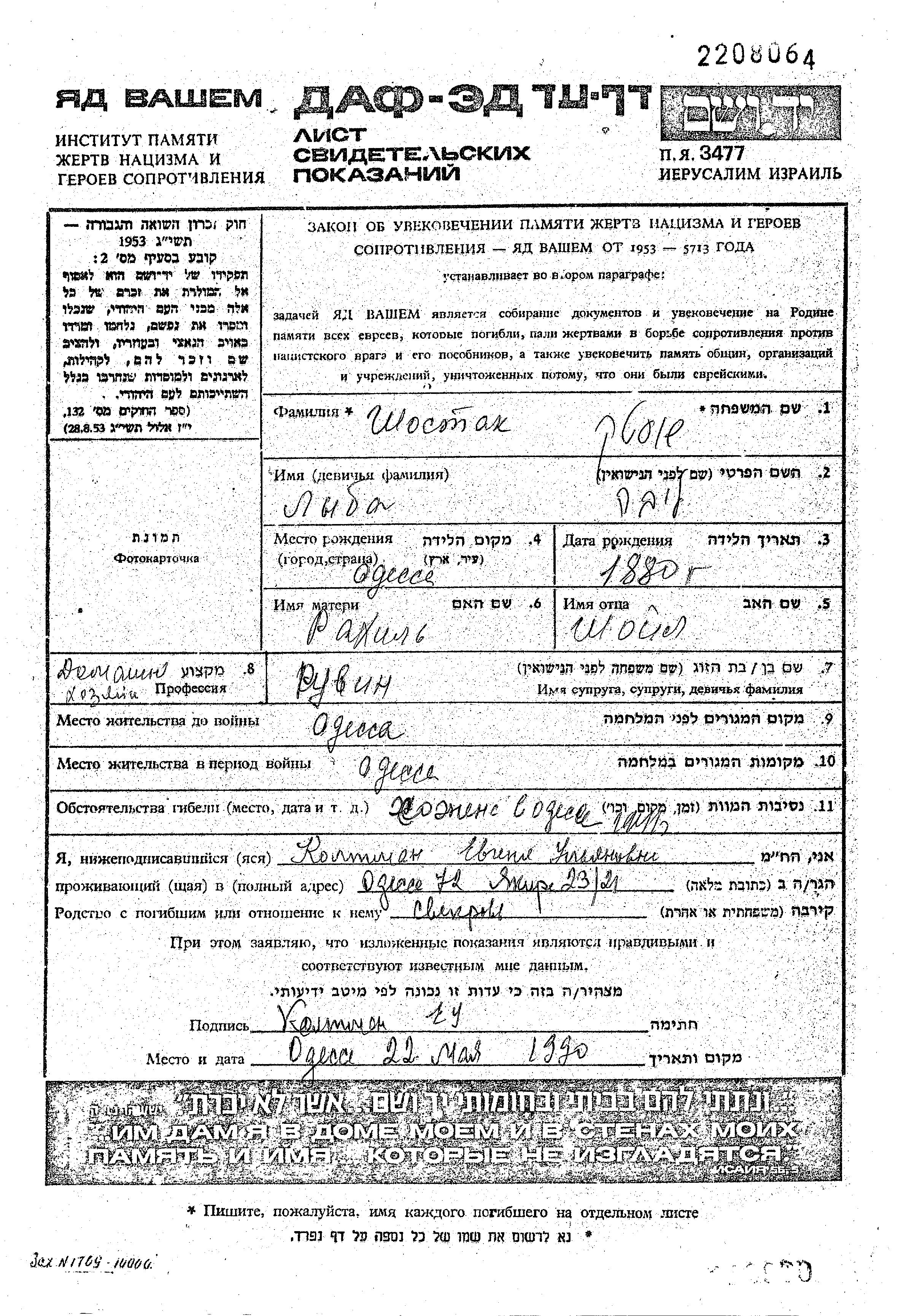 Shostak Liba 1880 Odessa, Ukraine (URSS) Feuille de témoignage