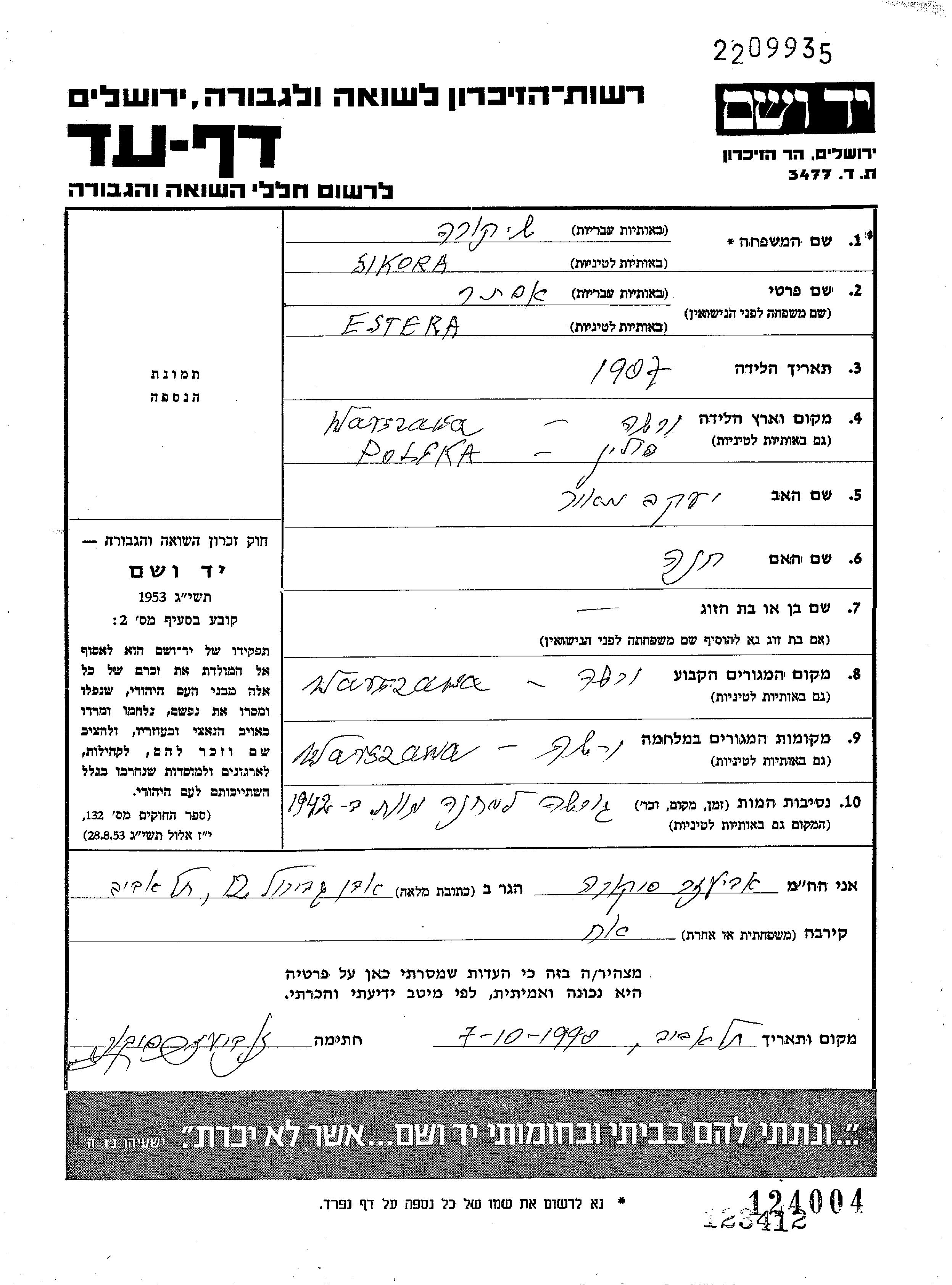 Sikora Estera 1907 Warszawa, Pologne Feuille de témoignage