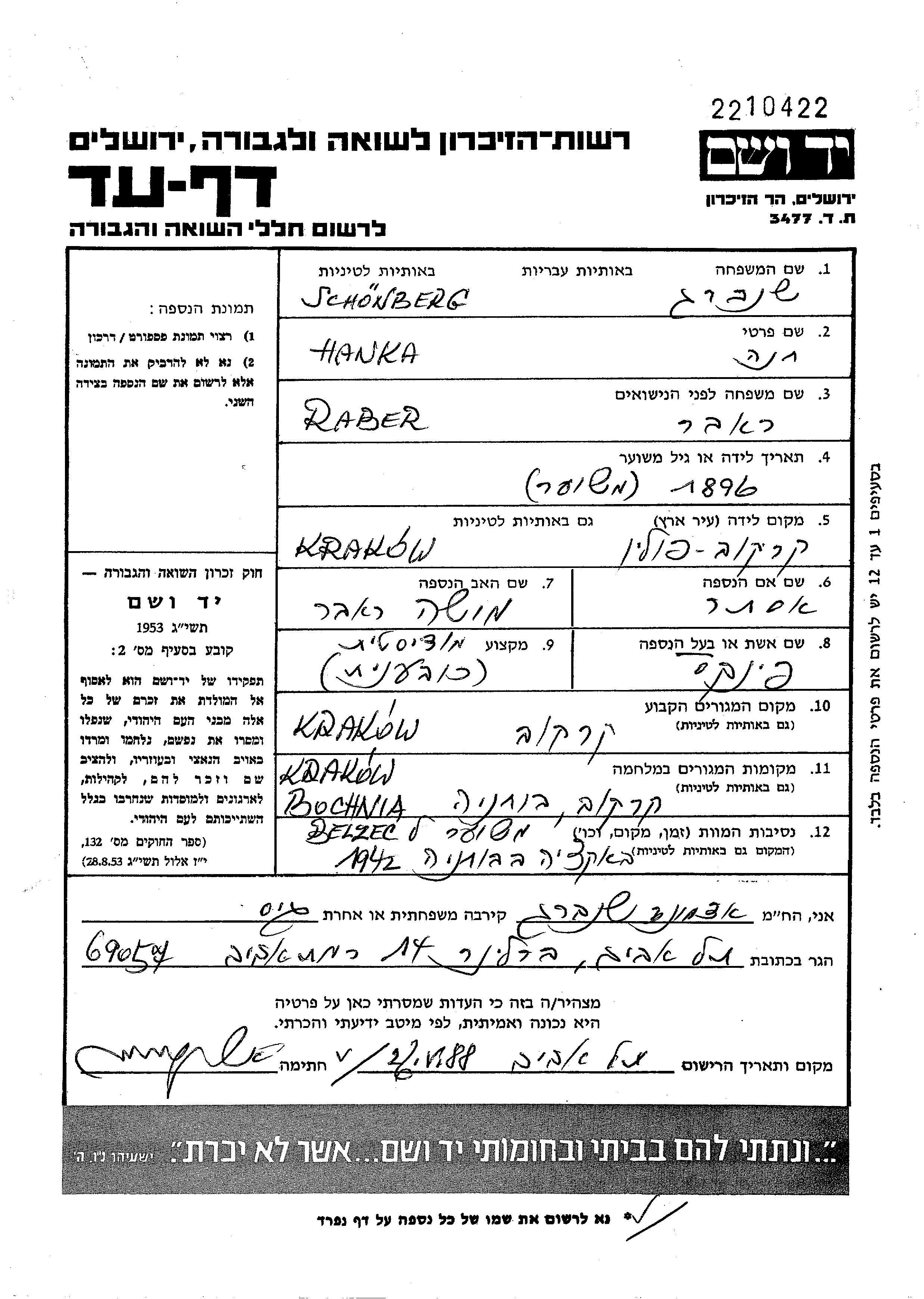 Hanka Schoenberg née Raber est née à Krakow, Pologne en 1896, fille de Moshe et de Ester. Elle était Couturière et Mariée à Pinkhas. Avant la seconde guerre mondiale elle vivait à Krakow, Pologne. Pendant la guerre, elle était à Krakow, Pologne.