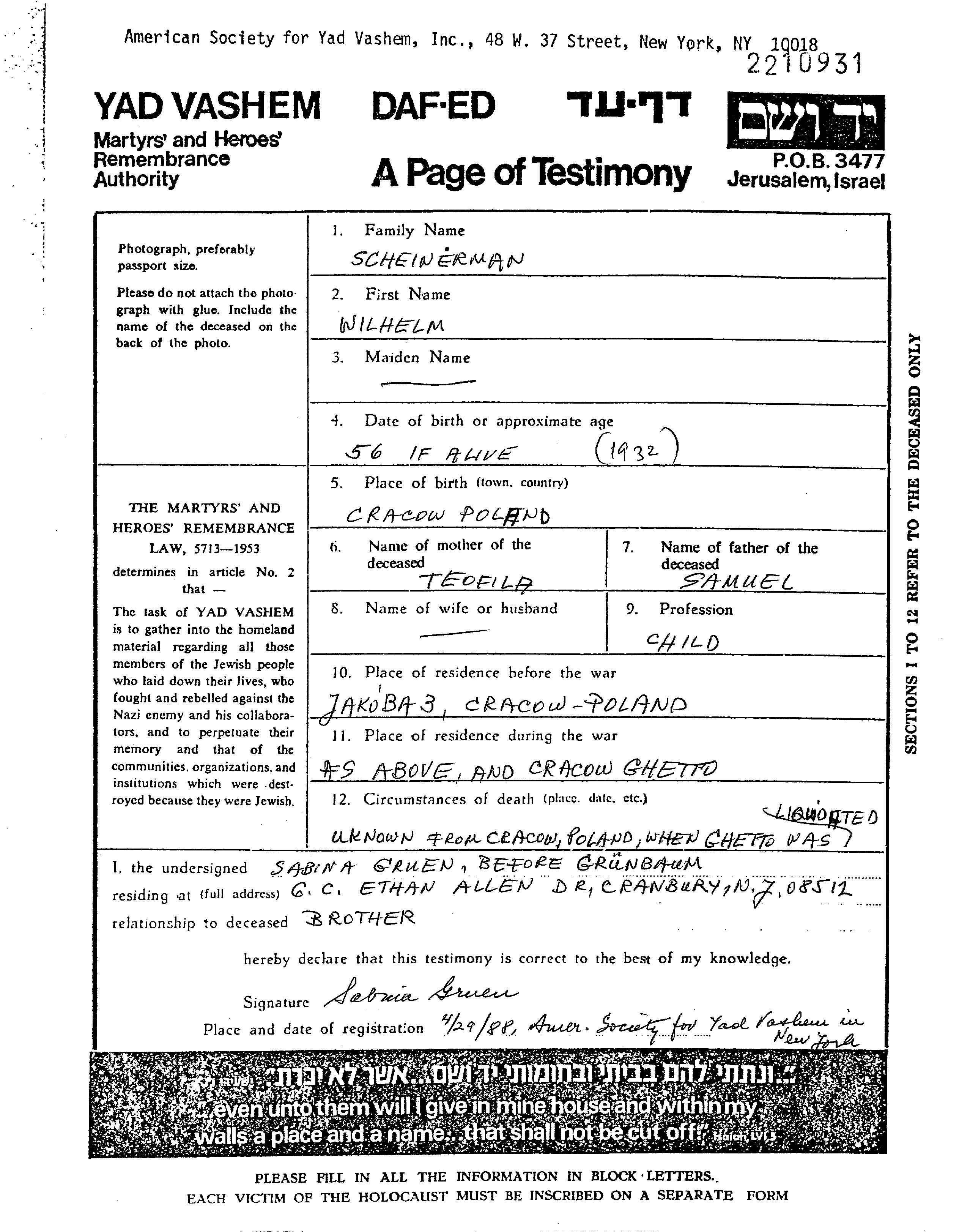 Scheinerman Wilhelm Krakow, Pologne Feuille de témoignage