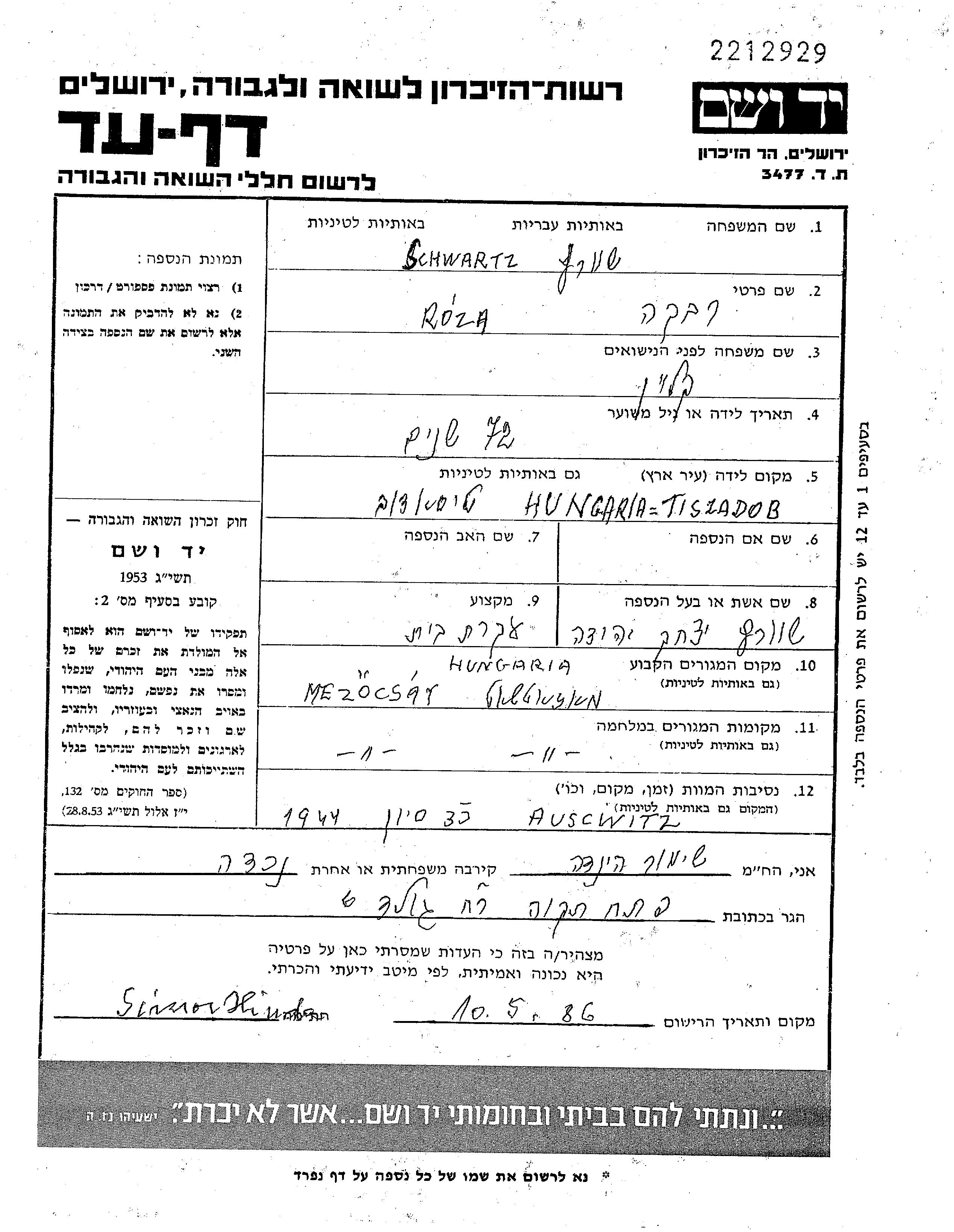 Schwartz Roza Rivka 1872 Mezocsat, Hongrie Feuille de témoignage