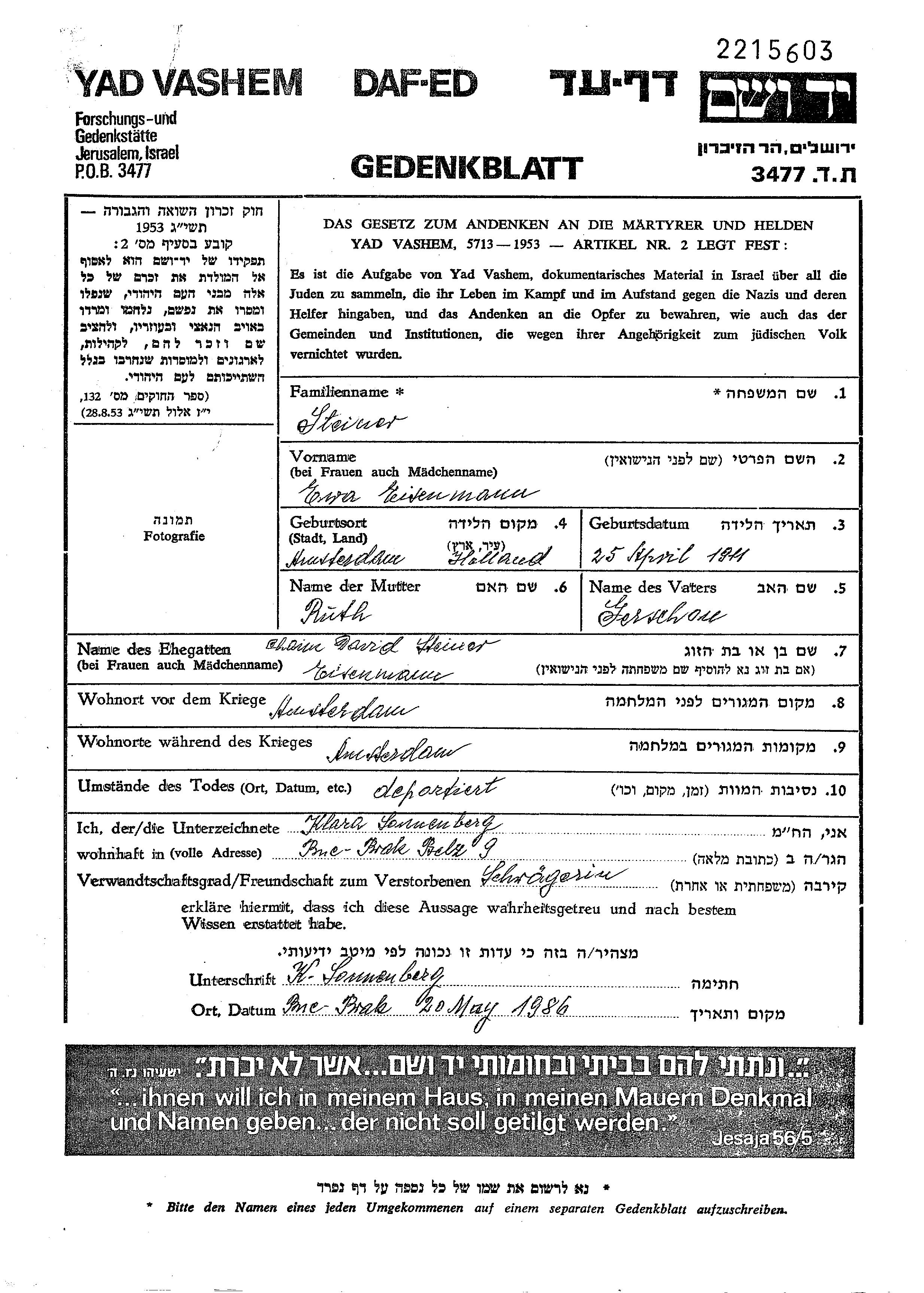 Ewa Steiner née Eisenmann est née à Amsterdam, Pays-Bas en 1911, fille de Gerschon et de Ruth. Elle était Mariée à Chaim David. Avant la seconde guerre mondiale elle vivait à Amsterdam, Pays-Bas. Pendant la guerre, elle était à Amsterdam, Pays-Bas.