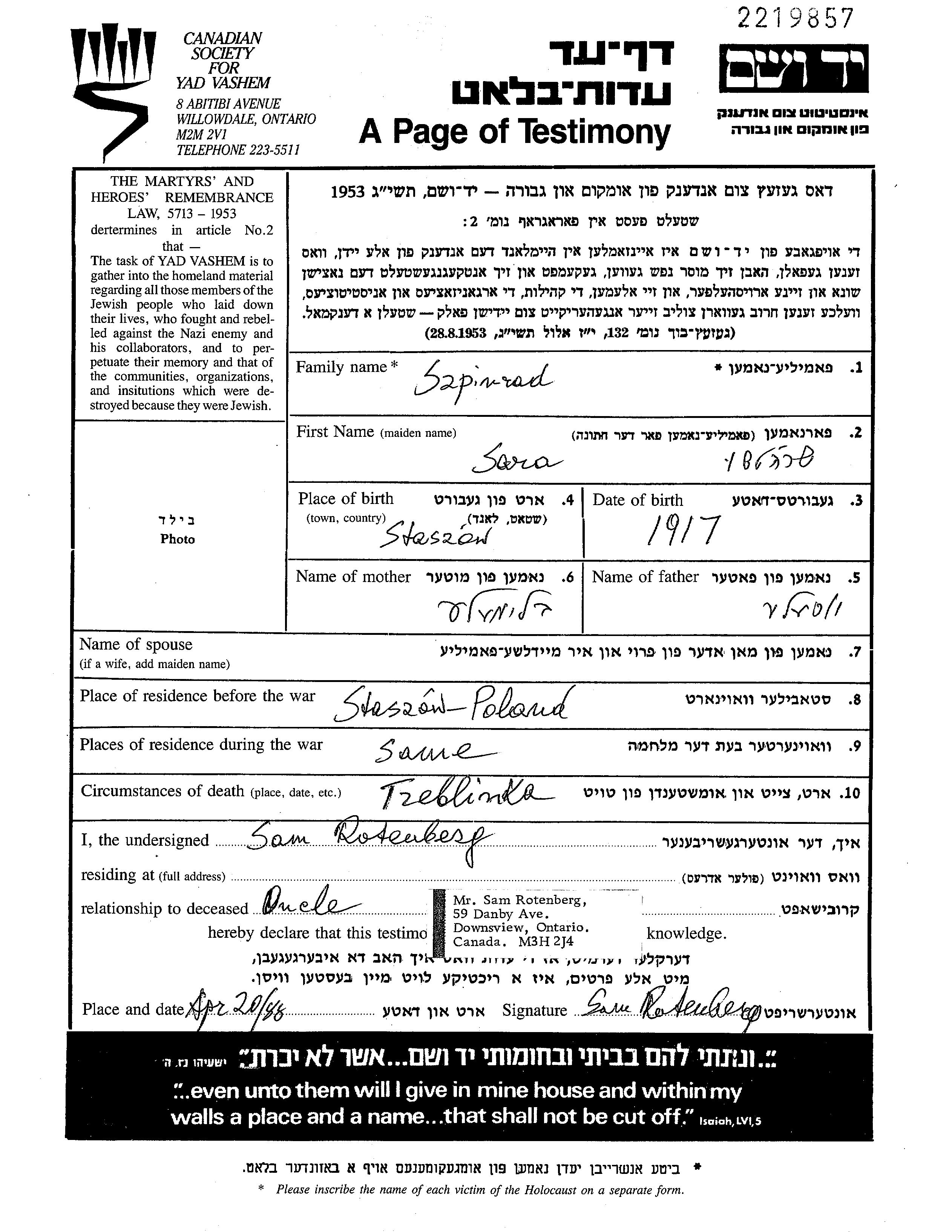 Szpinrad Sara Staszow, Pologne Feuille de témoignage