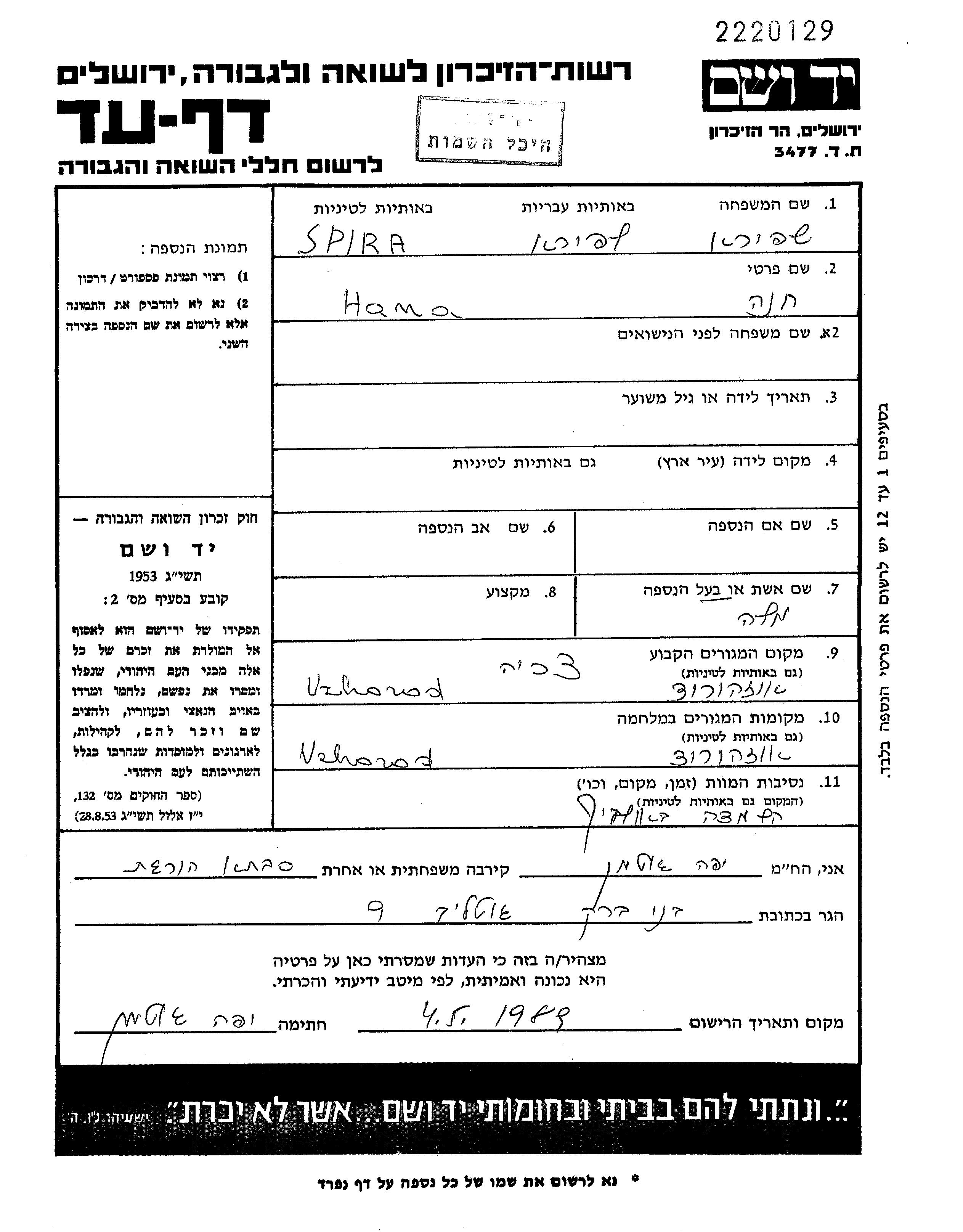 Hana Spira. Elle était Mariée à Moshe. Avant la seconde guerre mondiale elle vivait à Uzhorod, Tchécoslovaquie. Pendant la guerre, elle était à Uzhorod, Tchécoslovaquie.