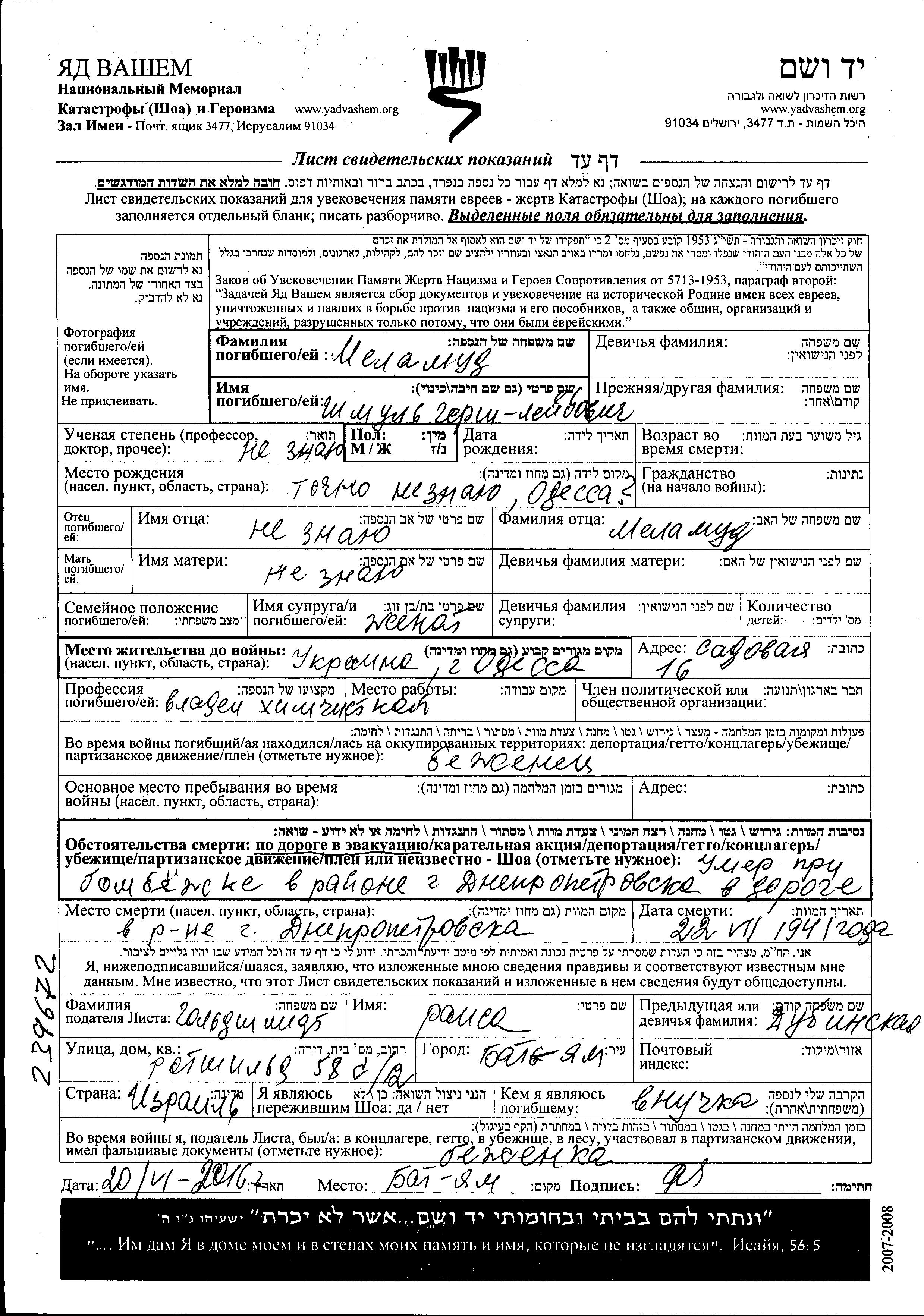 Melamud Shmul Odessa, Ukraine (URSS) Feuille de témoignage