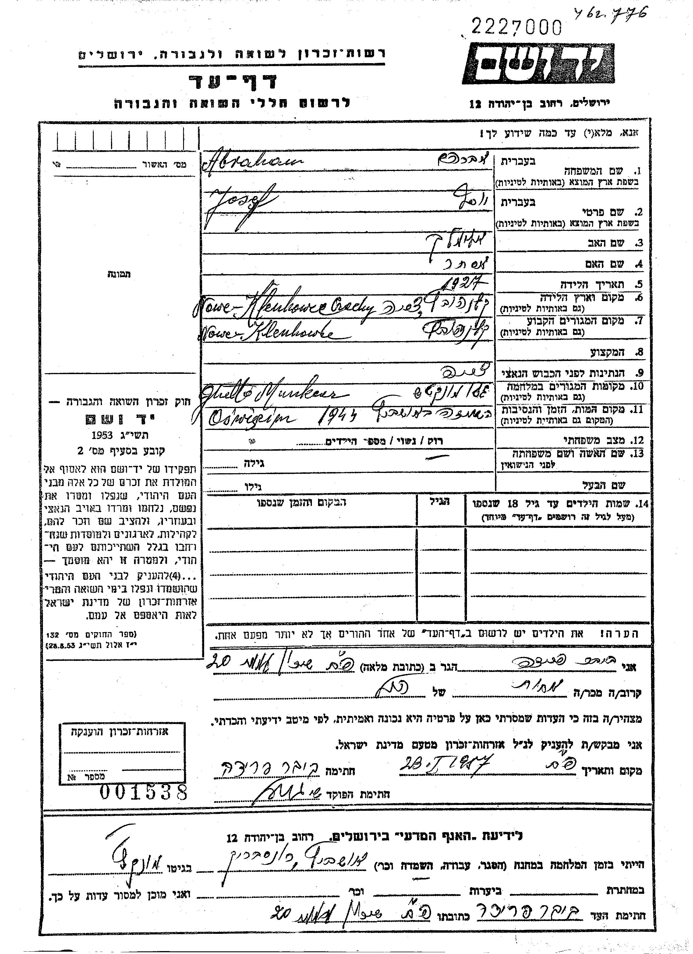 Abraham Josef 1927 Novy Klenovec, Tchécoslovaquie Feuille de témoignage