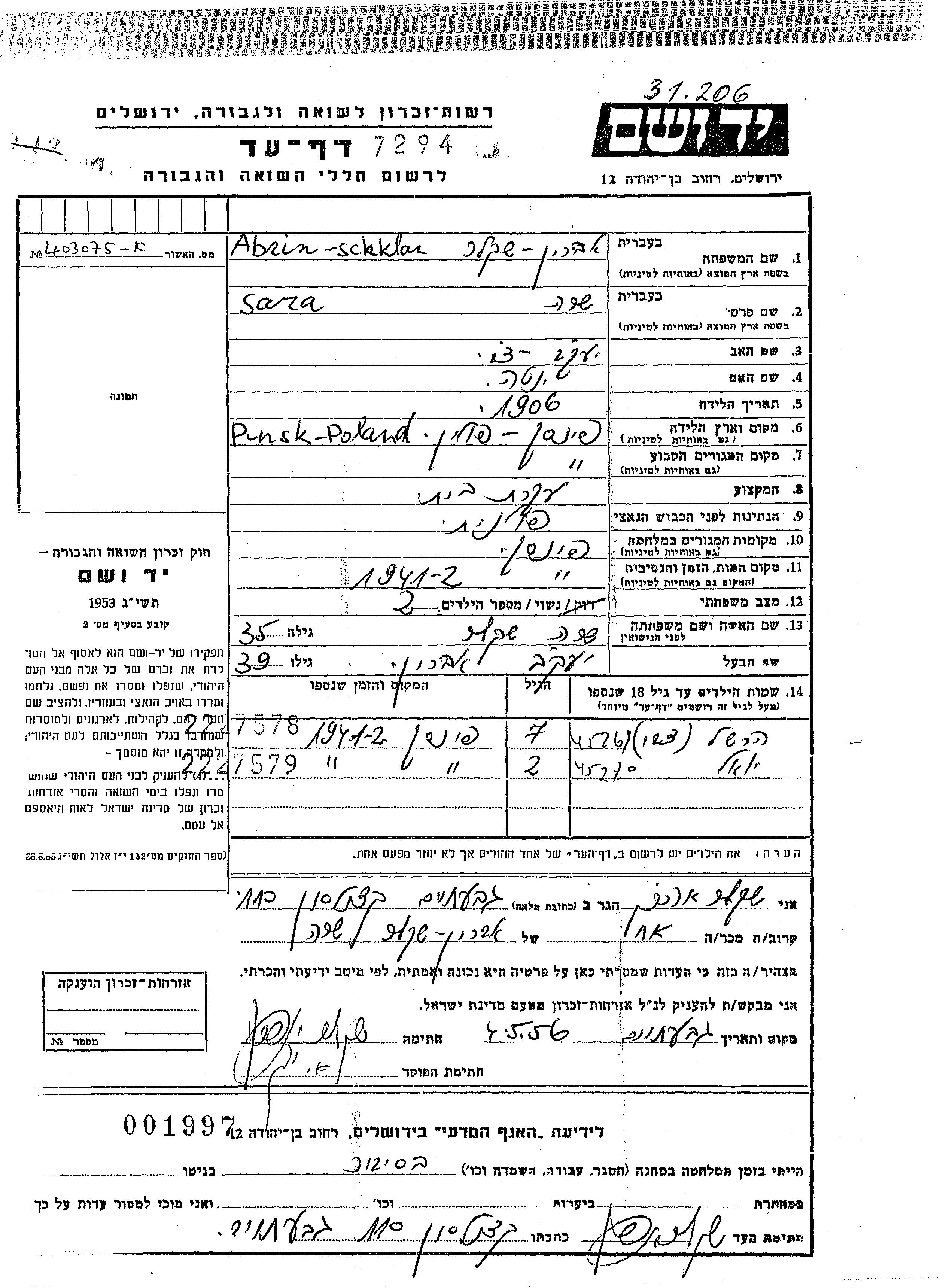 Abrin Hershel Tzvi endroit inconnu, Feuille de témoignage